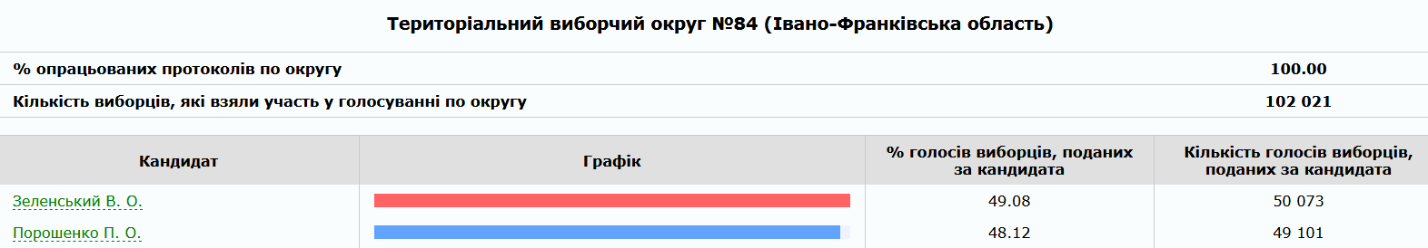 Центральна виборча комісія опрацювала 100% протоколів Тисменицького ТВО №84 (місто Бурштин, частина Івано-Франківська, Тисменицький, Тлумацький райони, частина Галицького району)