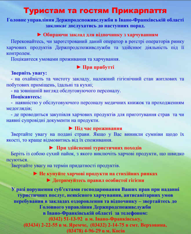Аби відпочинок кожного був безтурботним та радісним і залишив лише приємні спогади, Головне управління Держпродспоживслужби в Івано-Франківській області підготувало для туристів та гостей Прикарпаття тематичну листівку з рекомендаціями щодо вибору закладу відпочинку та харчування.