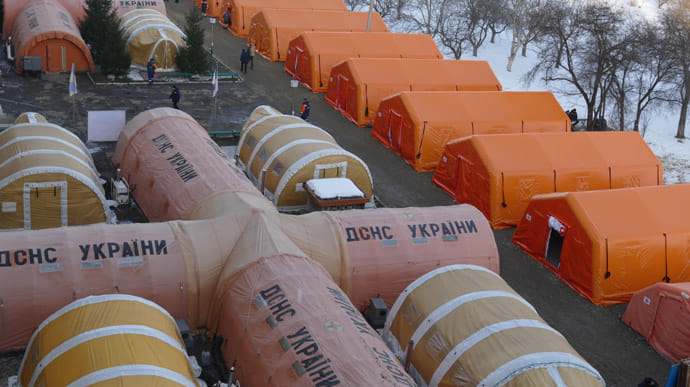 Наразі тут почали складати обладнання у коробки й відносити їх до вантажівок. Самі намети поки стоять.