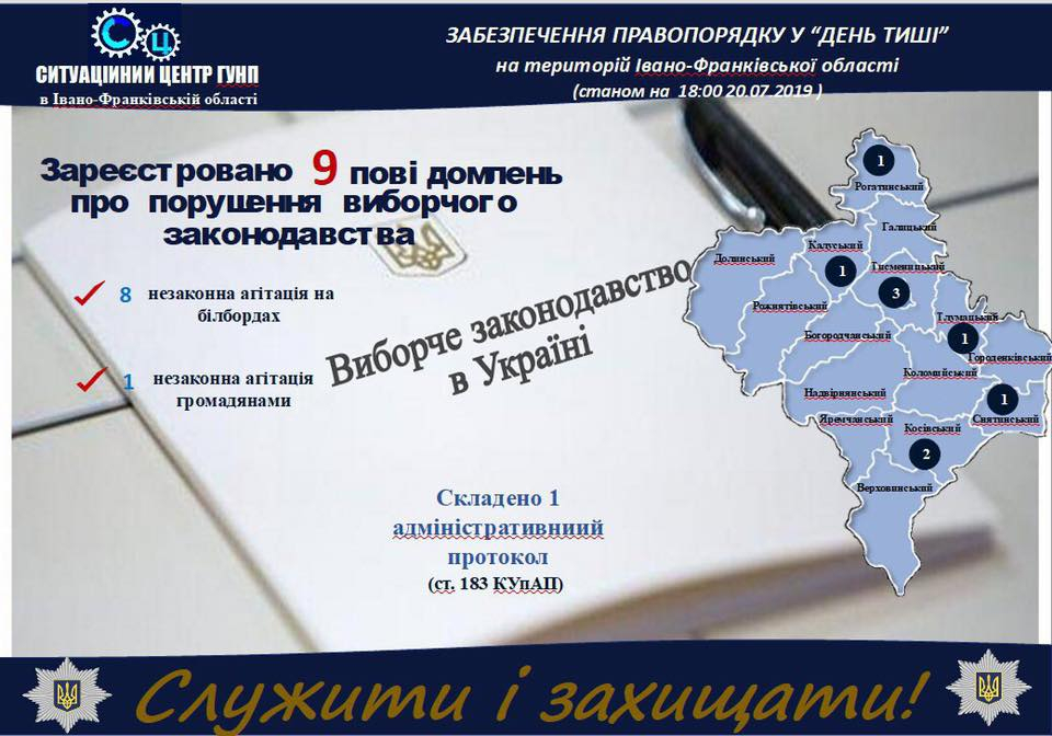 Здебільшого йдеться про факти, пов’язані з незаконною агітацією на білбордах (8)та незаконною агітацією громадянами (1), які були виявлено у Косівському, Рогатинському, Снятинському районах, Тлумачі та Івано-Франківську. За одним із фактів поліцейські склали на мешканця Снятинщини адміністративний протокол за ст. 183 (Завідомо неправдивий виклик спеціальних служб) КУпАП. Щодо інших проводиться перевірка.