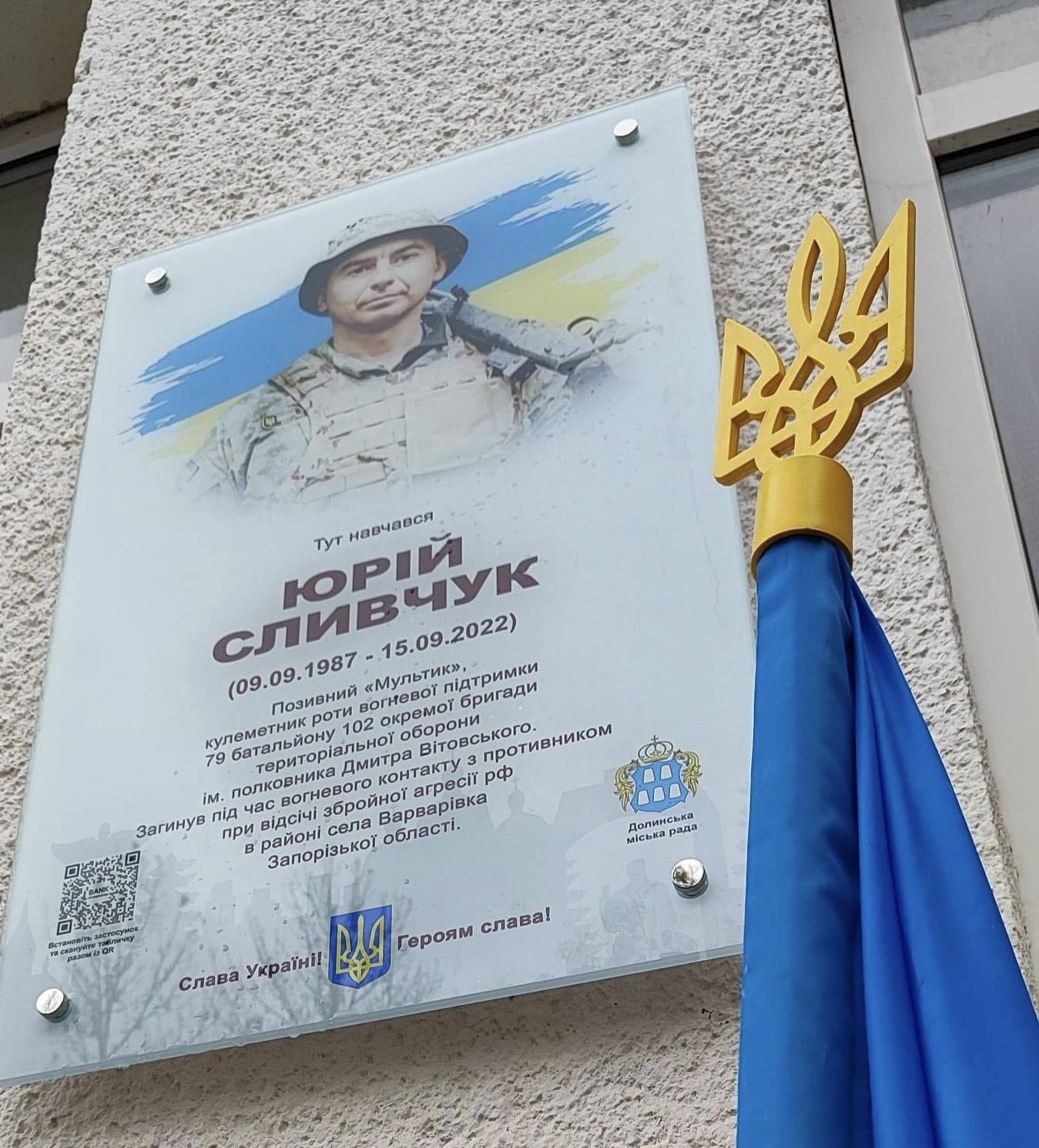 Сьогодні, 15 вересня, у Долинському ліцеї №5 відбулося урочисте відкриття та освячення інтерактивної меморіальної дошки на честь Юрія Сливчука — випускника цього ліцею, який загинув рівно рік тому, захищаючи територіальну цілісність України.