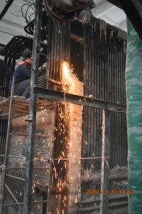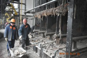 Робочі займаються демонтажем системи водогрійних труб за допомогою газової різки, адже метал треба ретельно зібрати. Паралельно демонтуються залишки цегляної кладки. Дуже скоро на місці старого котлоагрегату залишиться вільне місце для монтажу новітнього теплогенеруючого обладнання, чим незабаром займуться французькі фахівці.