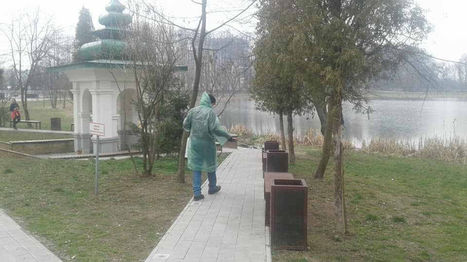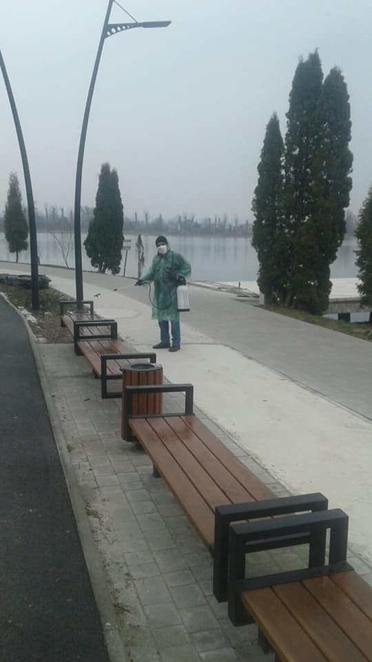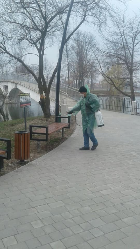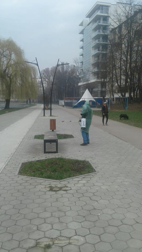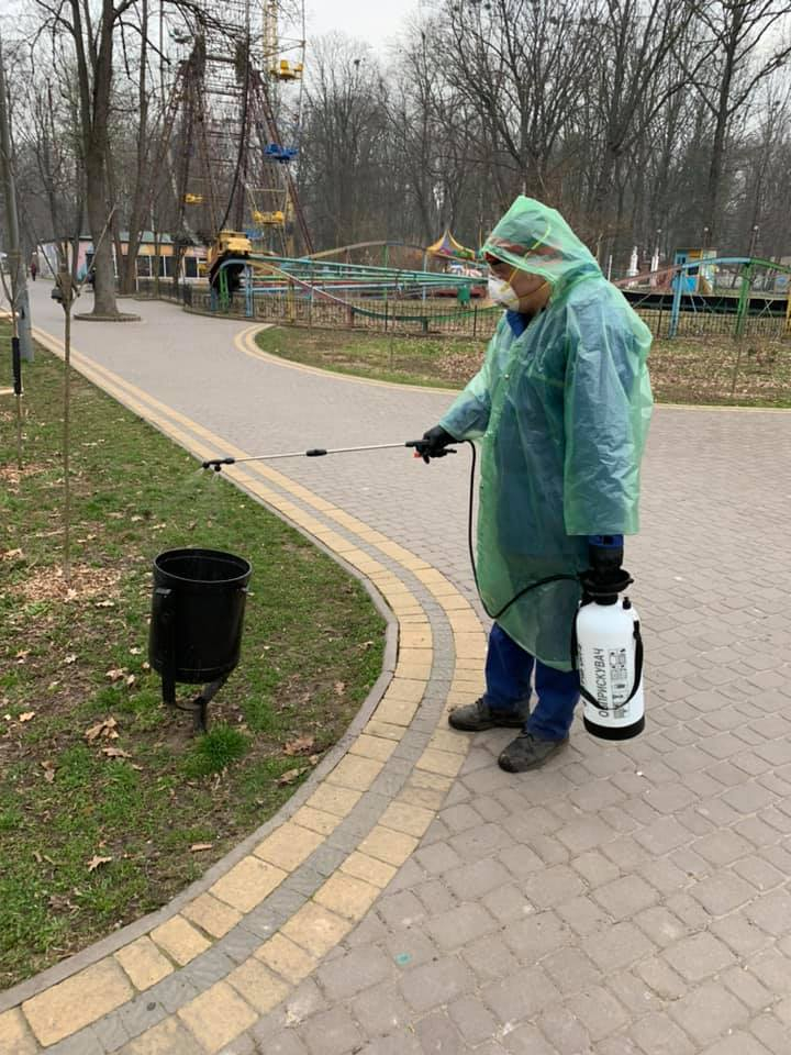 Працівники комунального підприємства "Центр розвитку міста та рекреації" у посиленому режимі дезінфікують територію парку.