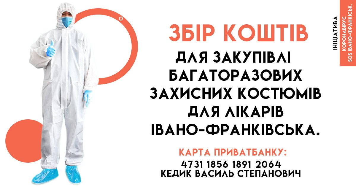 "Наша ініціатива є насамперед громадсько-інформаційна. Але до цього ми займались великою кількість організаційних питань — як ось шукали кошти великих спонсорів для фінансування потреб медиків. Зараз багато спілкуємось з лікарями Івано-Франківська. З іншій слів, такі засоби індивідуального захисту як багаторазові захисні костюми дуже потрібні зараз і потрібні будуть надалі. Ми знайшли надійного виробника таких костюмів. Тож ми починаємо самостійний збір коштів для закупівлі партії багаторазових захисних костюмів для медичних закладів міста", - кажуть активісти.