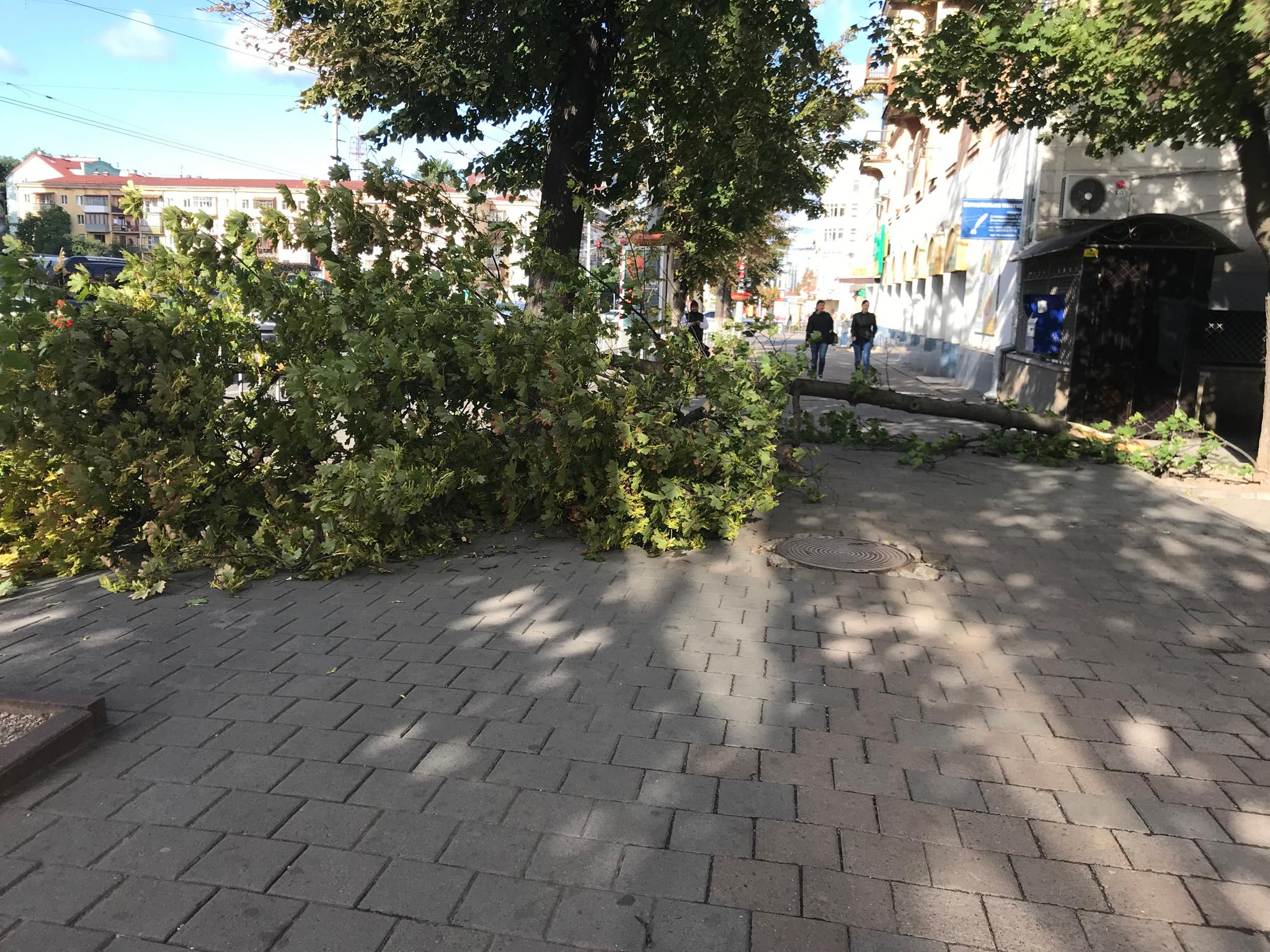 Гілка, яка відламалася від дерева, ледь не придавила чоловіка, котрий проходив тротуаром у момент падіння. На щастя, той встиг відскочити у сторону.