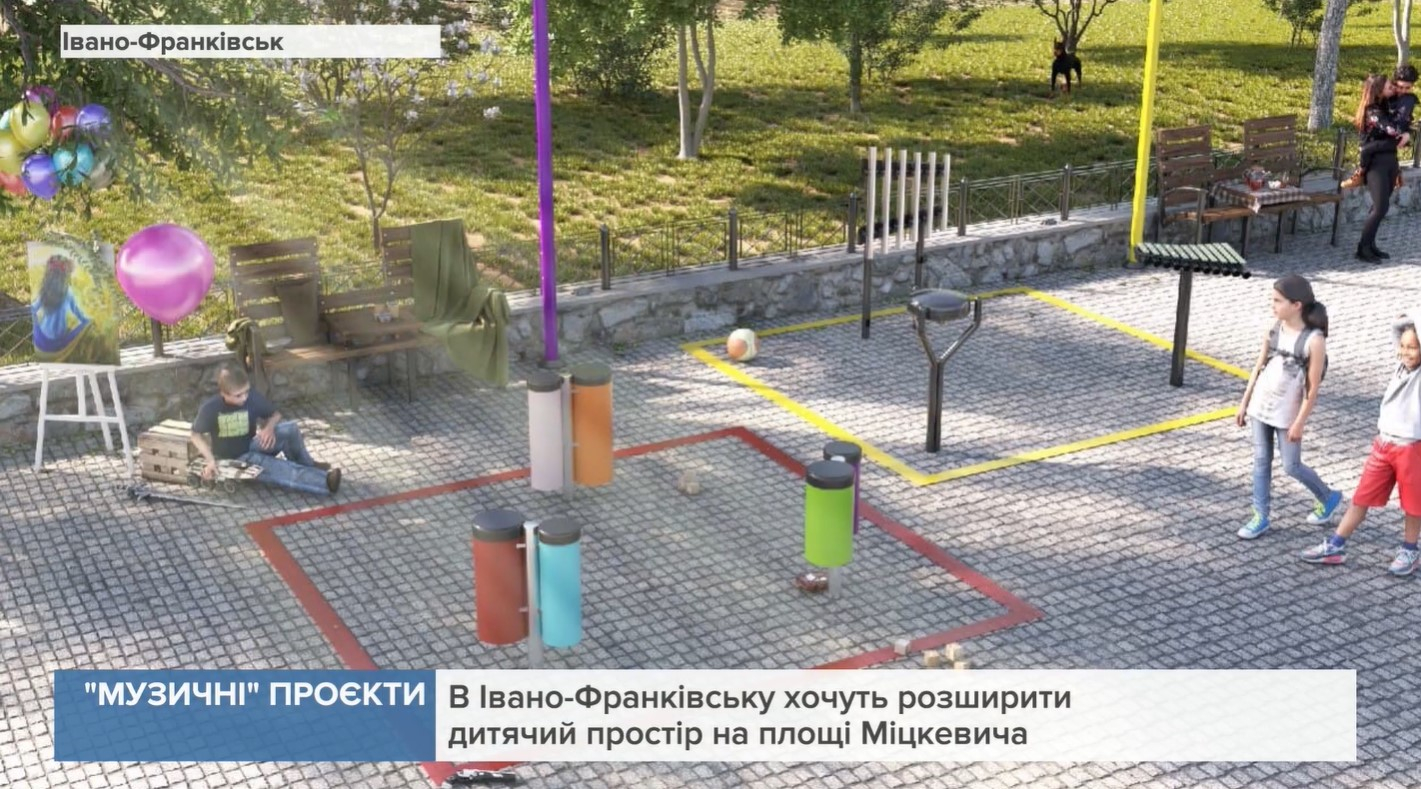 Різноманітні музичні інструменти, нові лавочки та сучасна ігрова зона. На площі Міцкевича хочуть розширити простір для дітей.
