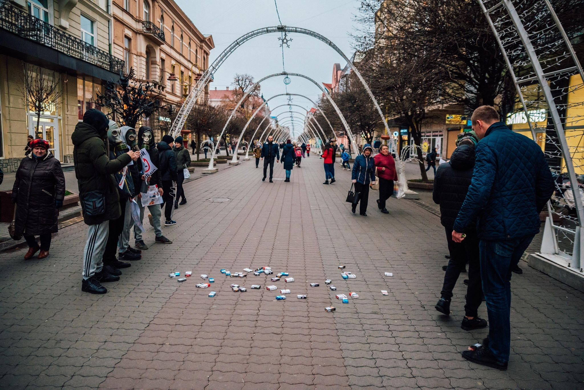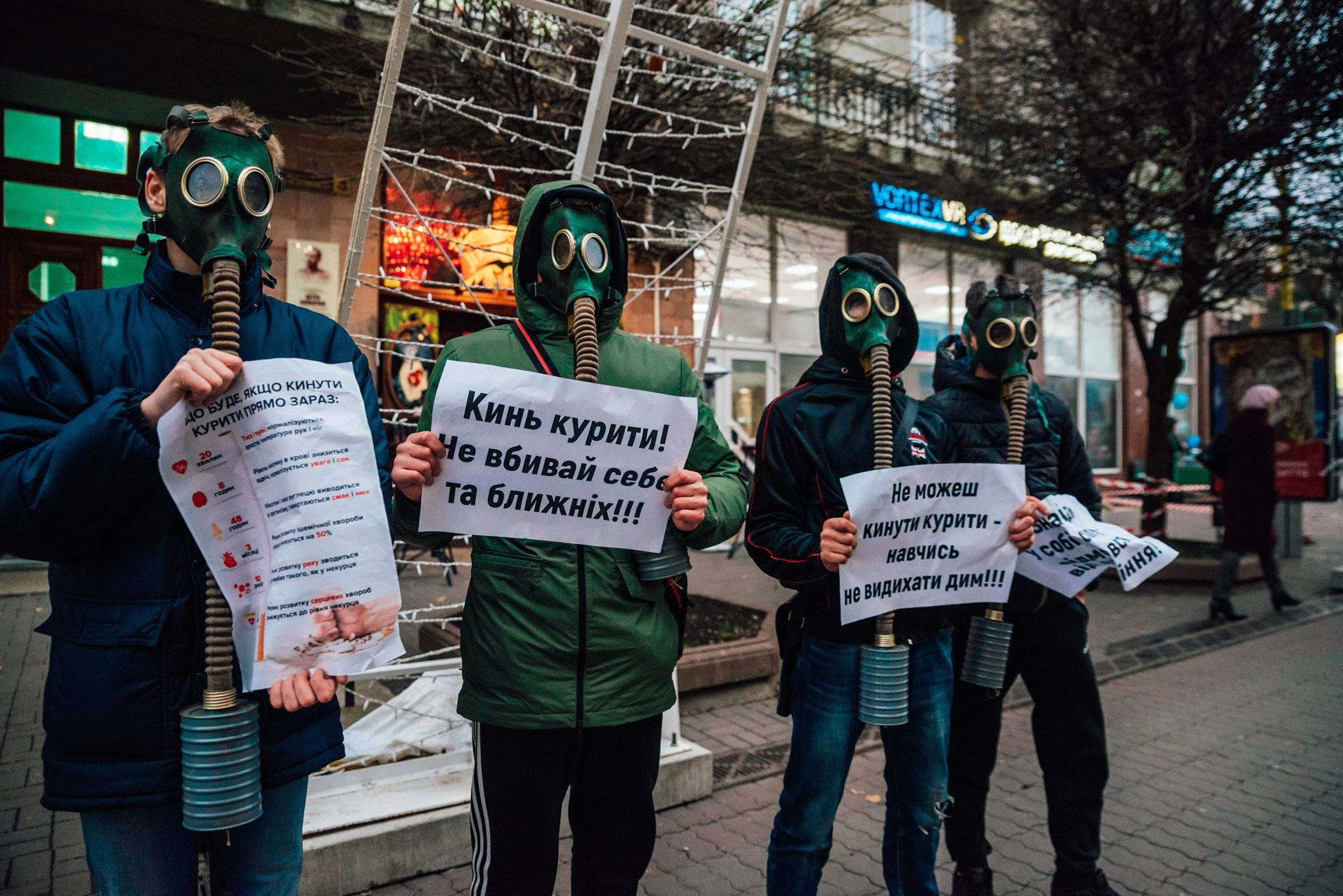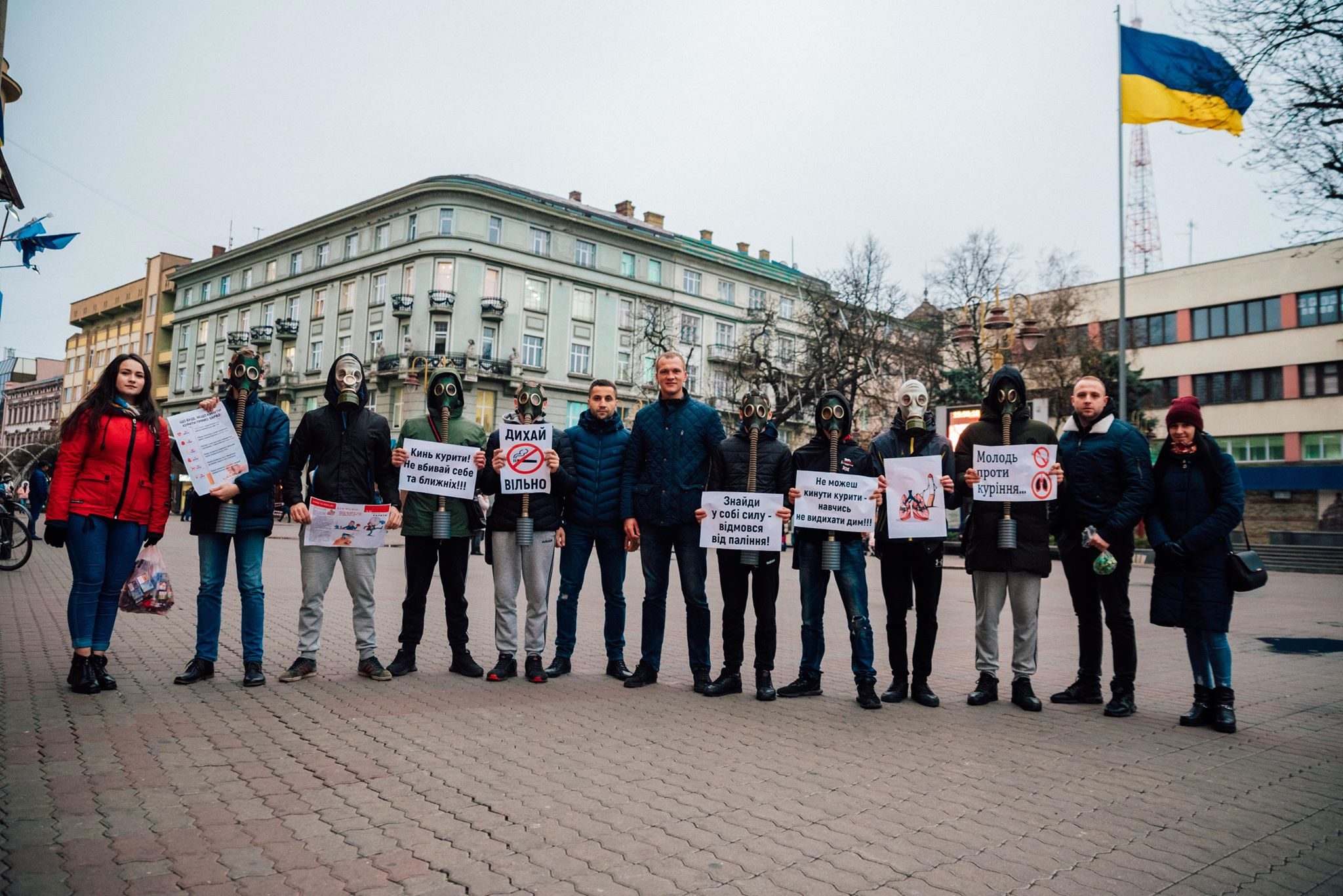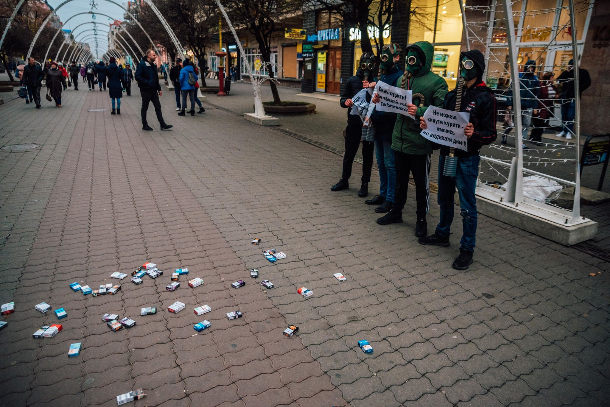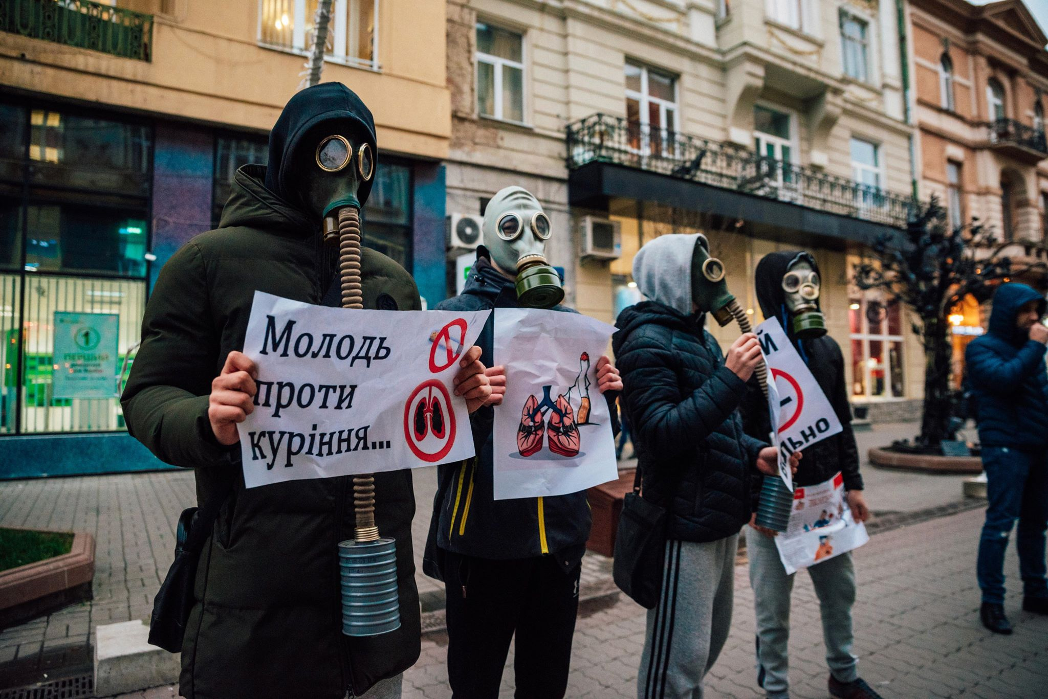 Хлопці у протигазах тримали інформаційні листівки про шкідливість куріння та заклики до ведення здорового способу життя. Дівчата вимінювали цигарки на цукерки, пише Фіртка.