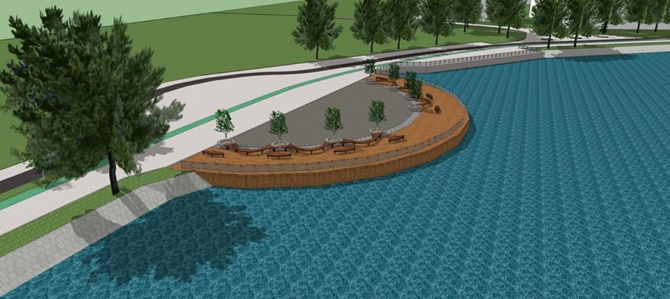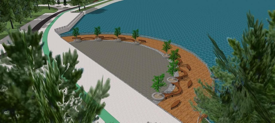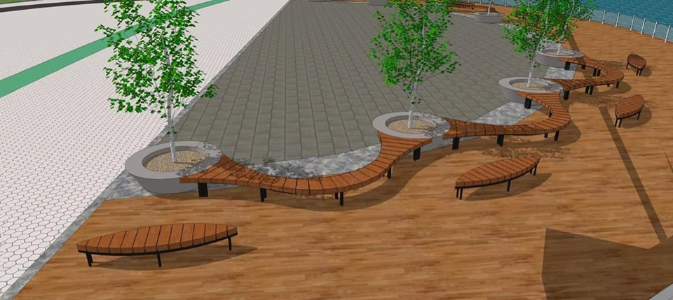 Тут будуть оригінальні лавочки, дерева в катках, ліхтарі освітлення, огородження зі скла, покриття з граніту та декінгу.