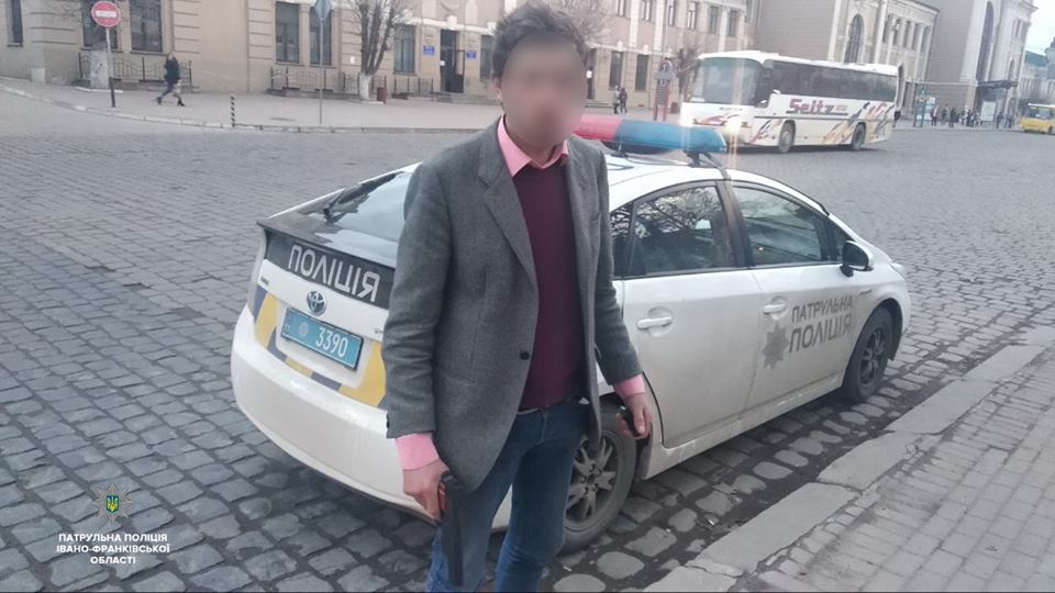 У суботу, 16 березня на площі Привокзальній мешканці й гості Івано-Франківська стали очевидцями, як чоловік тримав в руці предмет, схожий на пістолет. При цьому невідомий з кимось спілкувався по телефону, погрожуючи застосувати вогнепальну зброю.