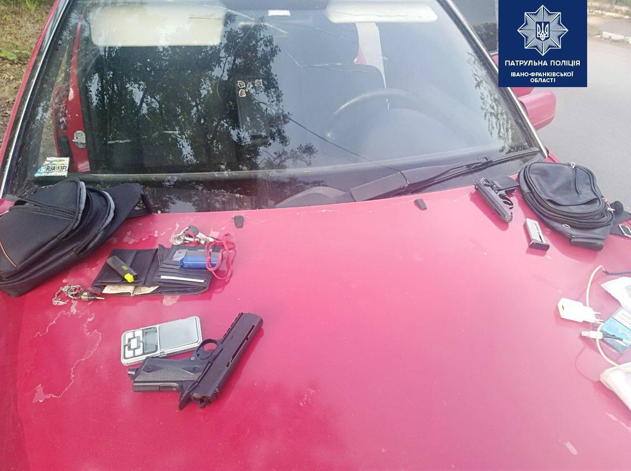 В результаті патрульні виявили предмет, схожий на пістолет. Жодних дозвільних документів на зброю чоловік інспекторам надати не зміг. У сумці 34-річного водія патрульні помітили згортки з білою порошкоподібною речовиною, схожою на наркотичну.
