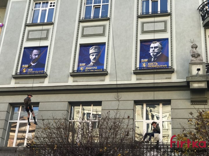Пластуни вивісили плакати із зображеннями діячів ЗУНР: Костя Левицького, Дмитра Вітовського та Лева Бачинського.