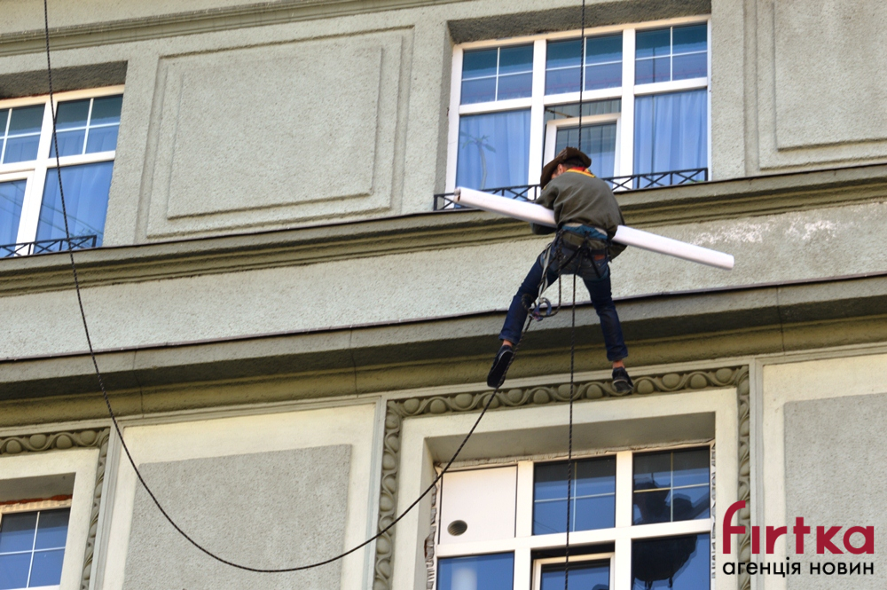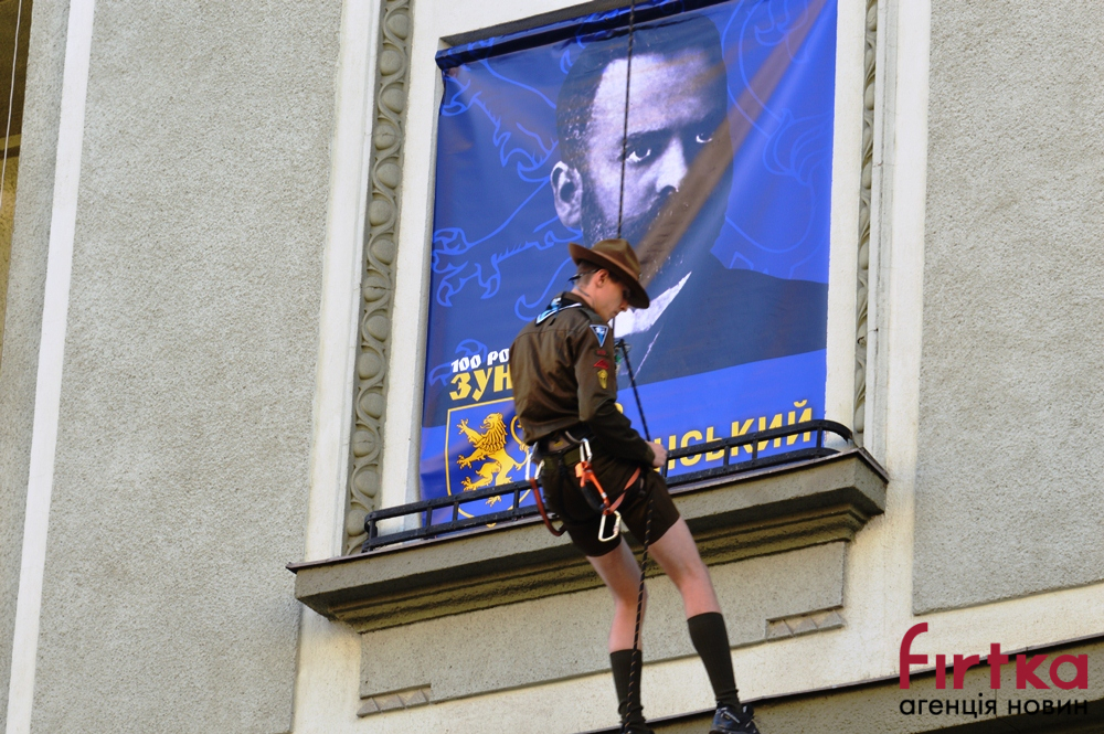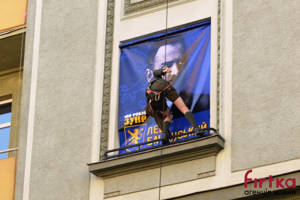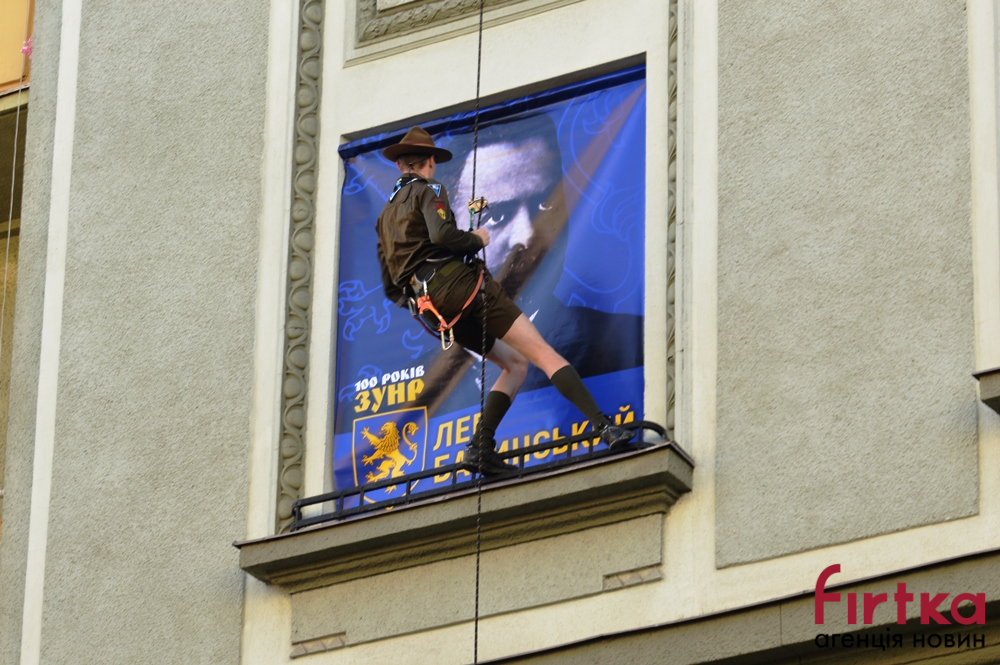 Дійство за участю пластунів-альпіністів, барабанщиків та трубача провели на фасаді колишнього готелю «Уніон» на стометрівці, передає кореспондент Фіртки.
