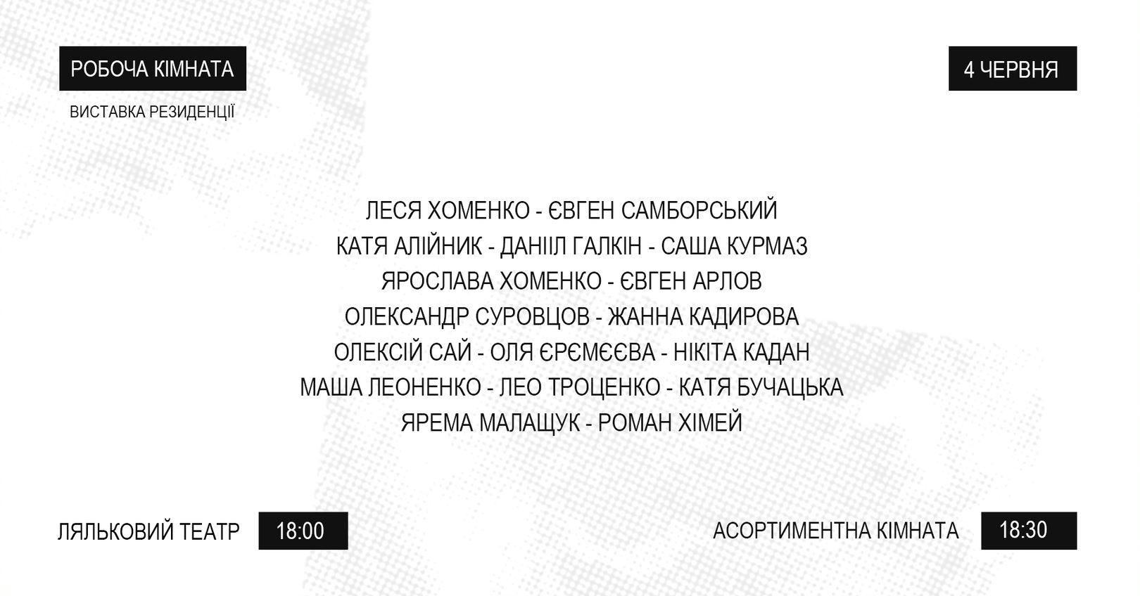 Мистецький захід 4 червня розпочнеться о 18:00 з перформансу Євгена Арлова в Ляльковому театрі, а продовжиться в «Асортиментній кімнаті» з 18:30, де презентують решту робіт.