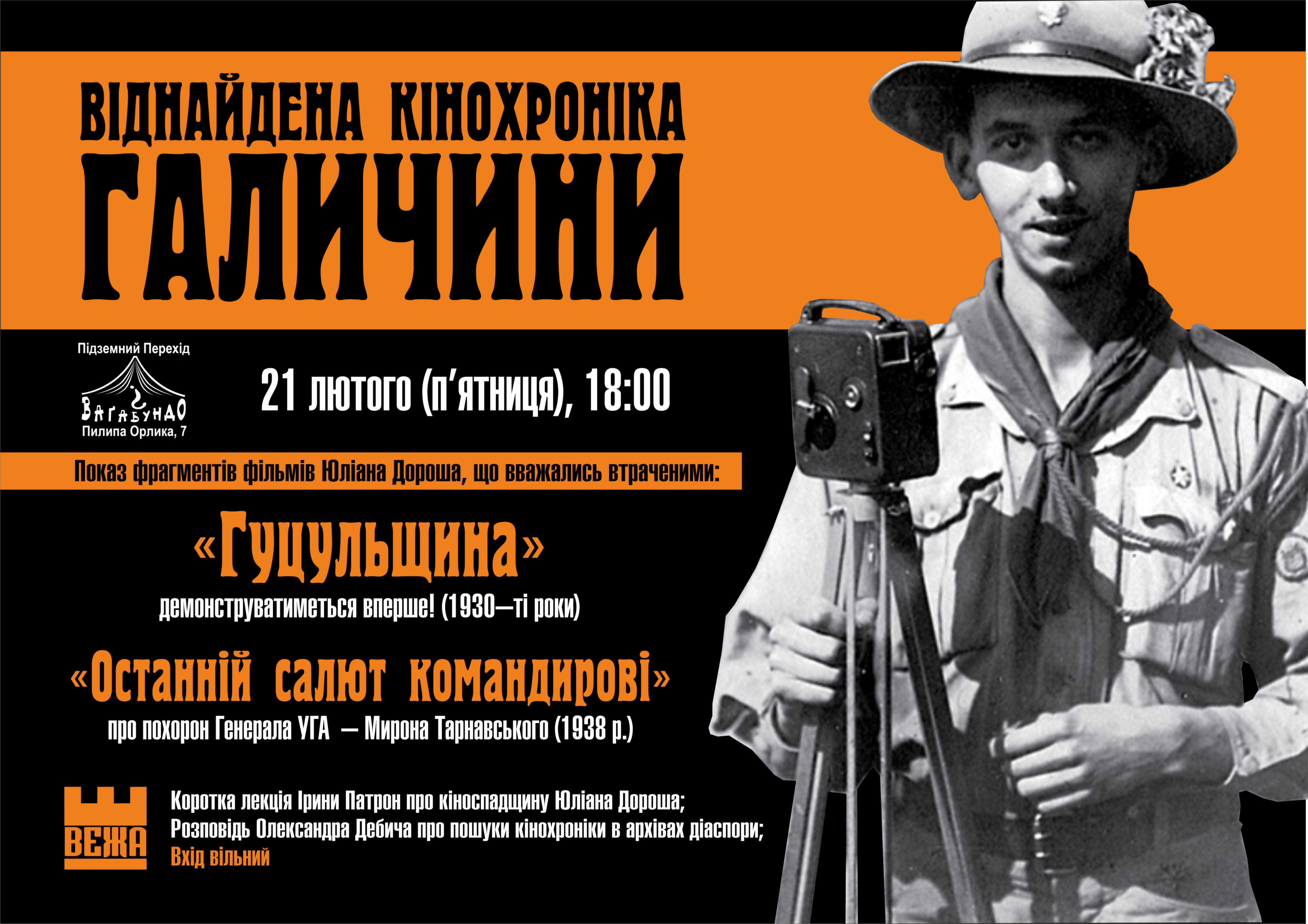 У п'ятницю, 21 лютого, о 18:00 год з ініціативи телерадіокомпанії "Вежа" в підземному переході "Ваґабундо" (вул. Пилипа Орлика, 7) відбудеться показ віднайдених кінохронік Галичини авторства Юліана Дороша та, ймовірно, Івана Яцентія, що досі вважались втраченими.
