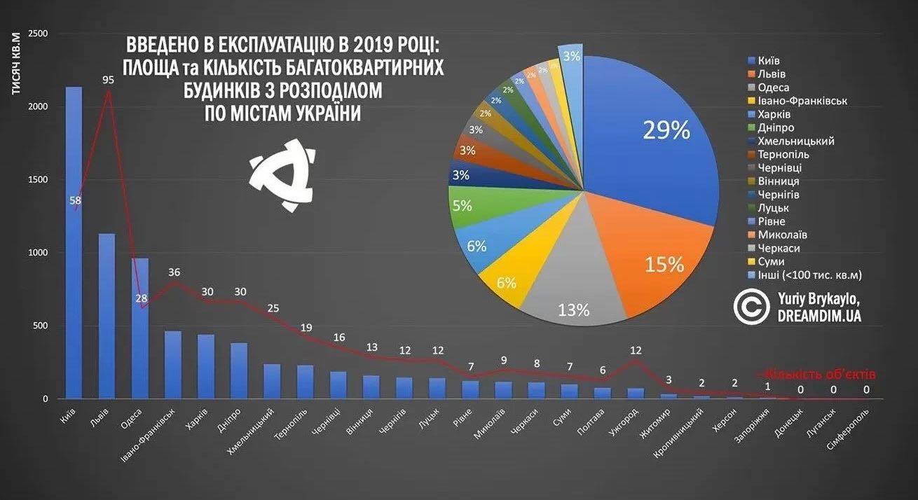 Лише у 2019 році найбільше багатоквартирних будинків введено в експлуатацію у Києві, що складає 29% від даних по усій Україні. На другому місці Львів (15%), на третьому Одеса (13%), на четвертому — Івано-Франківськ (6%).