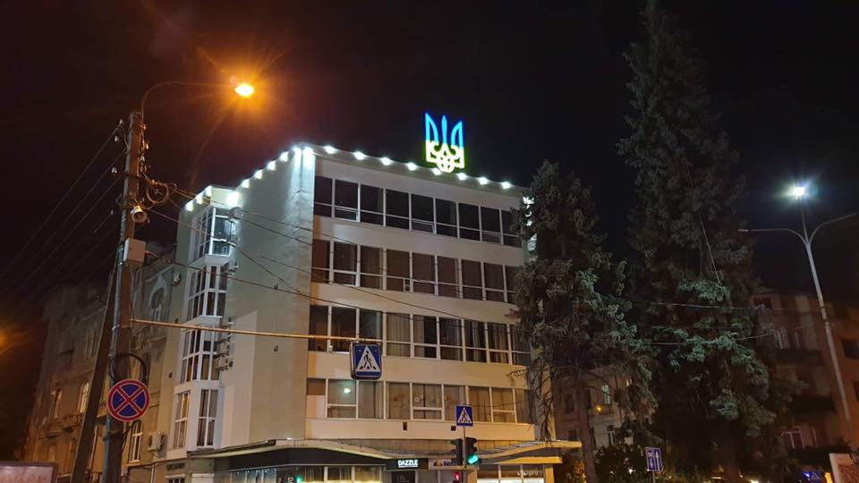 Нагадаємо, будівлю з оновленим гербом підсвітили влітку 2019 року.