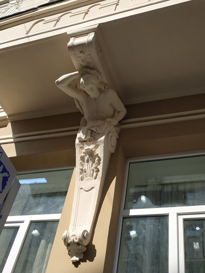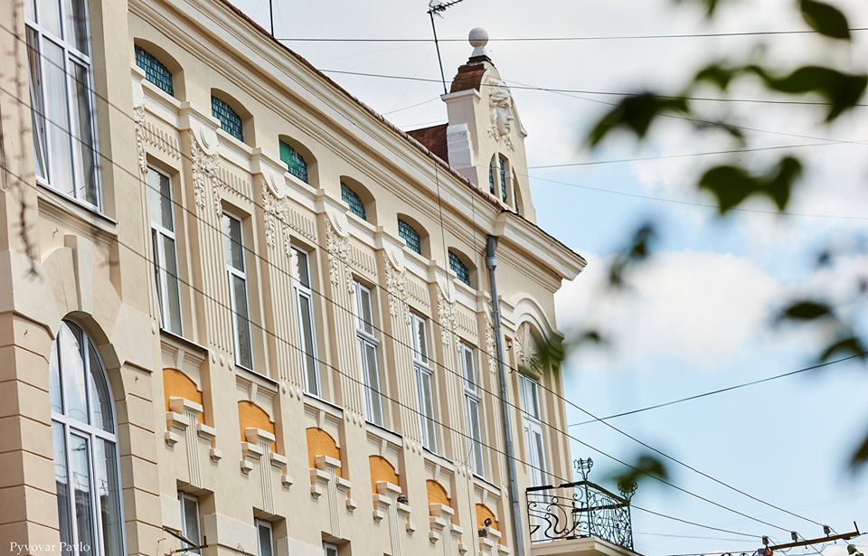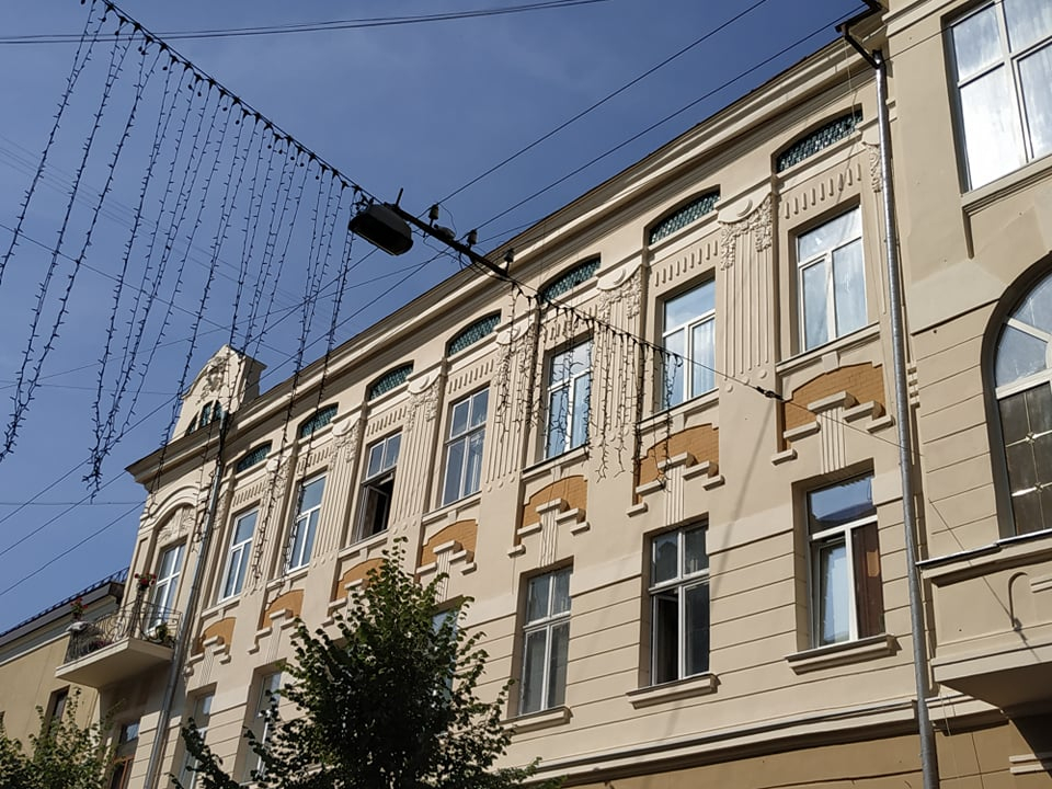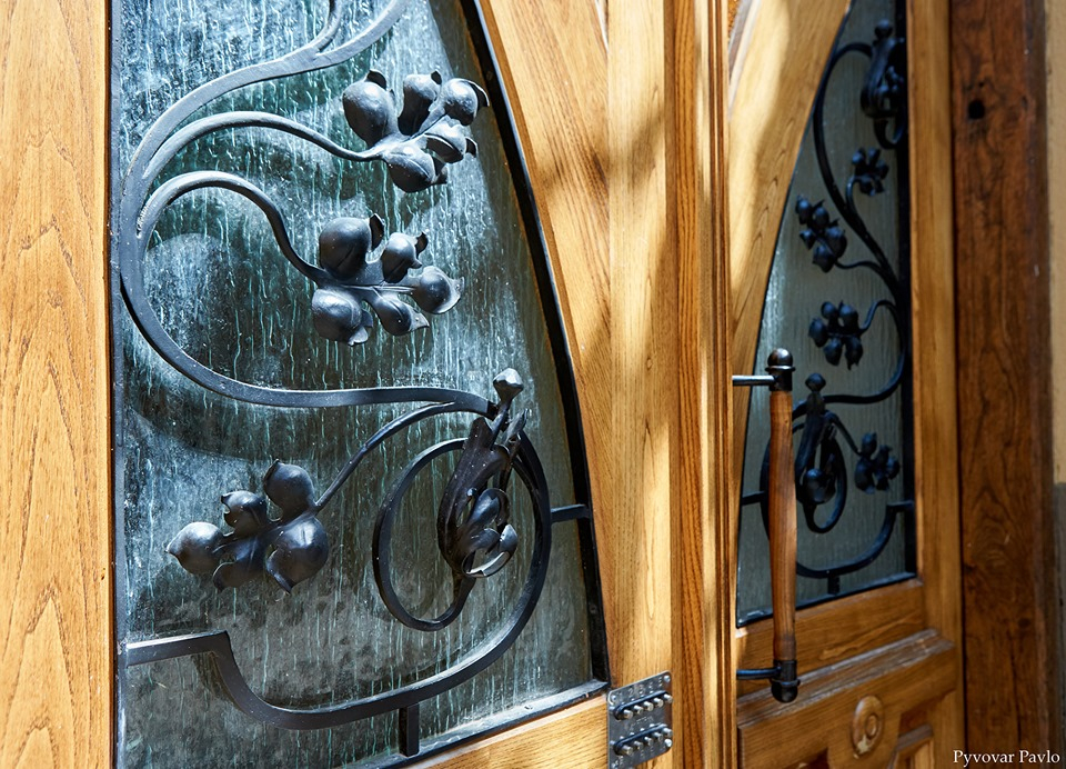 На цьому фасаді були виконані всі види реставраційної діяльності. Двері тут не міняли, вони старі, але спеціалісти відреставрували полотна та вітражі.