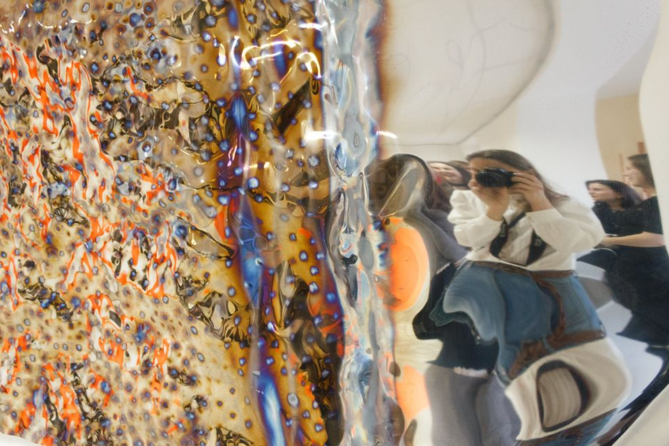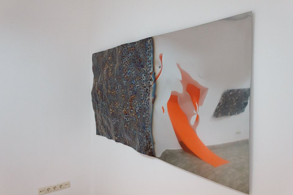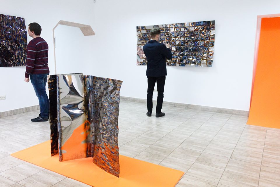 Для посилення цих «нерукотворних» властивостей у галереї встановлено масивні помаранчеві полотна, що рефлексують на полірованих листах, контрастуючи із фіолетовими та синіми плямами композицій.