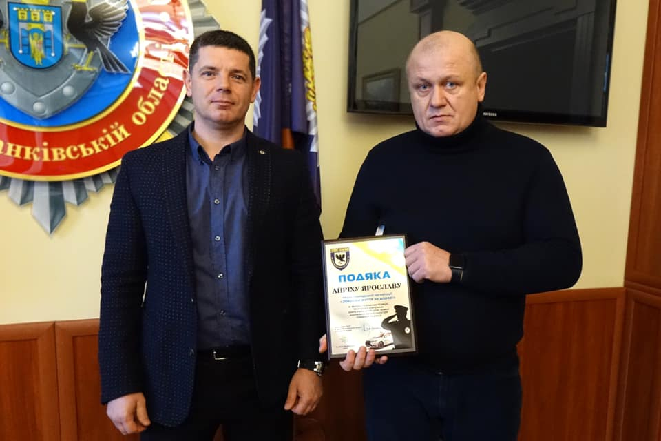 За активну громадську позицію, тісну співпрацю з поліцією Прикарпаття, а також за проведення спільних навчальних занять серед дітей щодо правил дорожнього руху та культури поведінки на дорозі подякою нагороджено - члена громадської організації «Збережи життя на дорозі» Ярослава Айріха.
