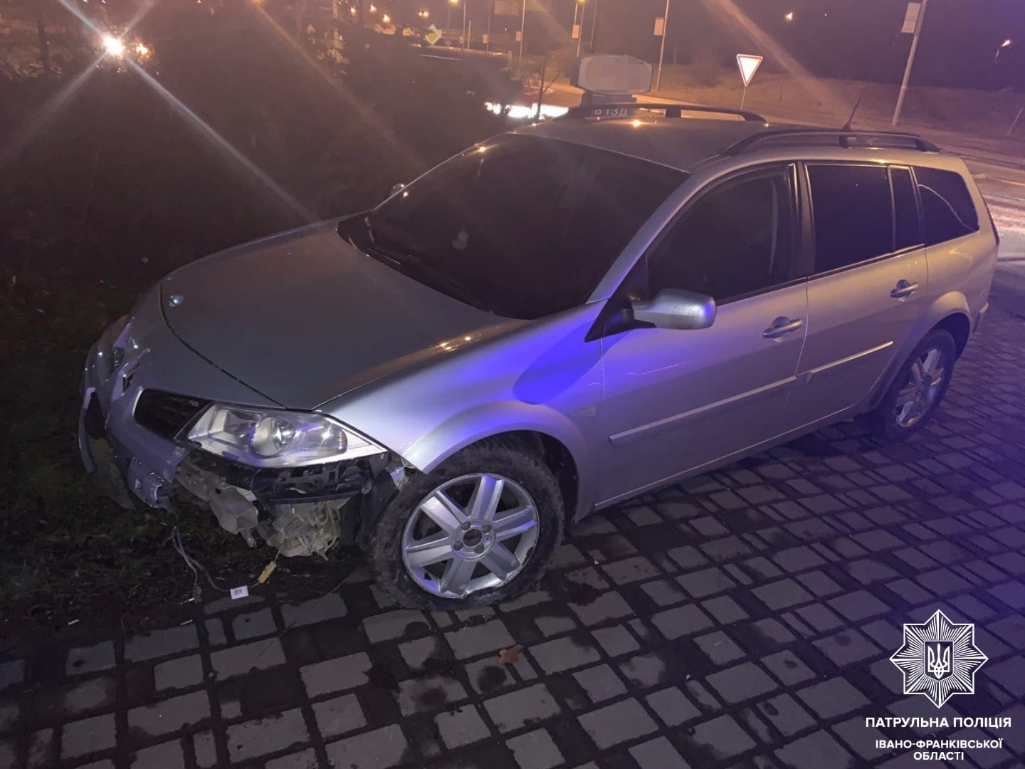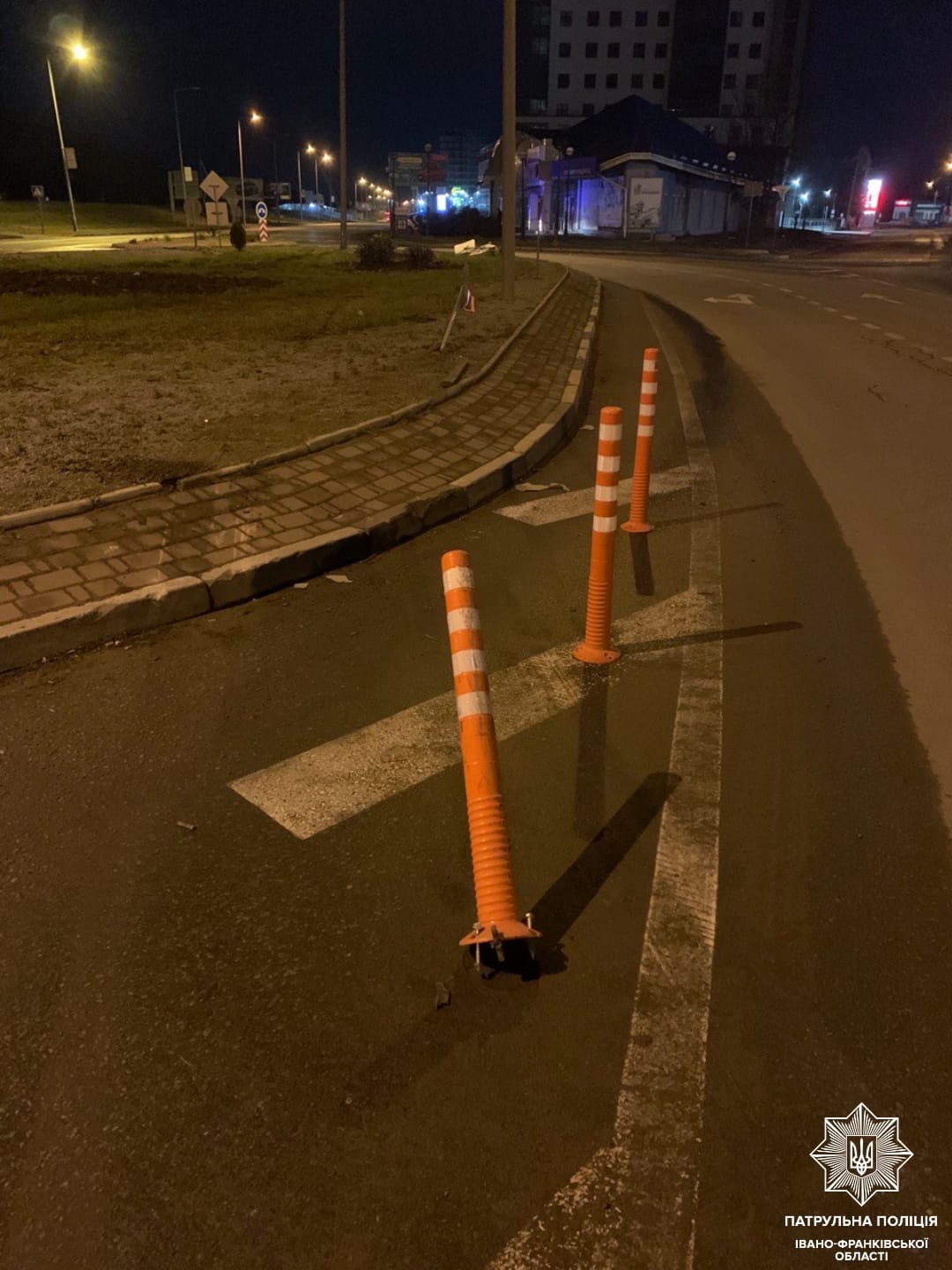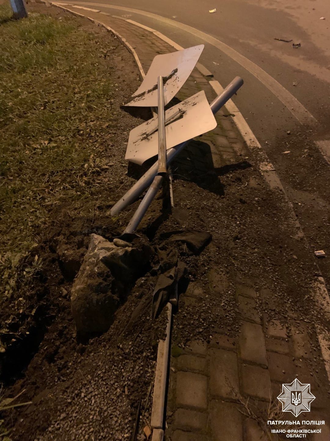 Патрульні, що прибули на місце виявили автомобіль Renault, водій якого не стежив за дорожньою обстановкою, не вибрав безпечної швидкості, внаслідок чого пошкодив дорожні знаки та стовпці.