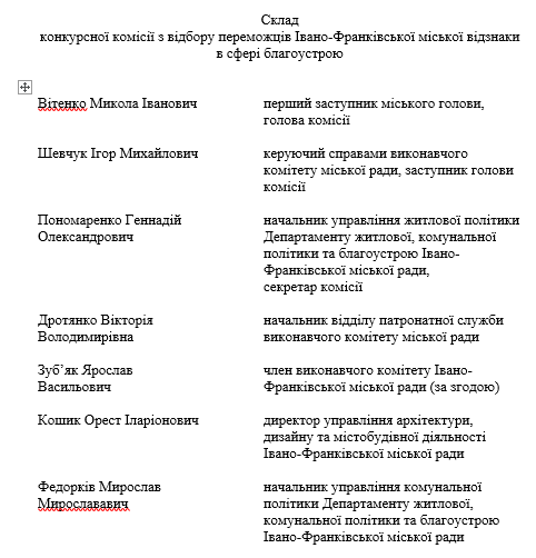 Виконавчий комітет Івано-Франківської міської ради затвердив склад конкурсної комісії з відбору переможців міської відзнаки у сфері благоустрою.