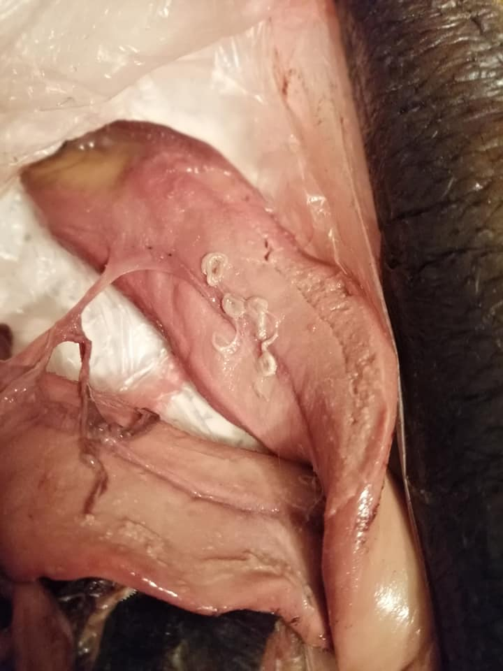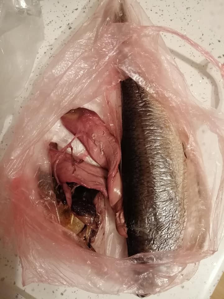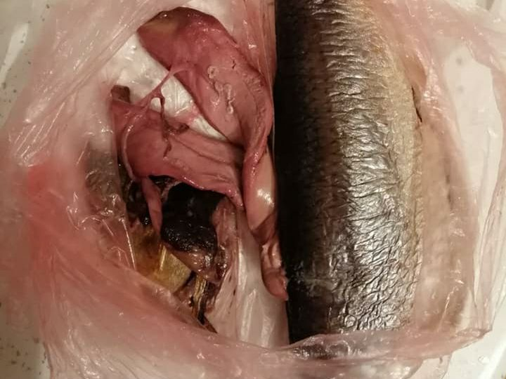 "Хочу поділитися фото рибки, яку я придбала сьогодні в магазині "Еко-маркет" (555) на Вовчинецькій. Оселедець холодного копчення, з багатьма сюрпризами всередині, у вигляді гельмінтів. Коли витягла з пакетів, в які її старанно запакували, то в ніс вдарив жахливий тухлий запах риби, що вже не перший день розкладається", - пише жінка.