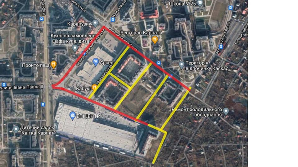 5. На період вихідних та святкових днів, а також у дні великого потоку клієнтів ТЦ «Арсену» - забезпечити виїзд транспорту на вул. Стуса через додатковий виїзд.
