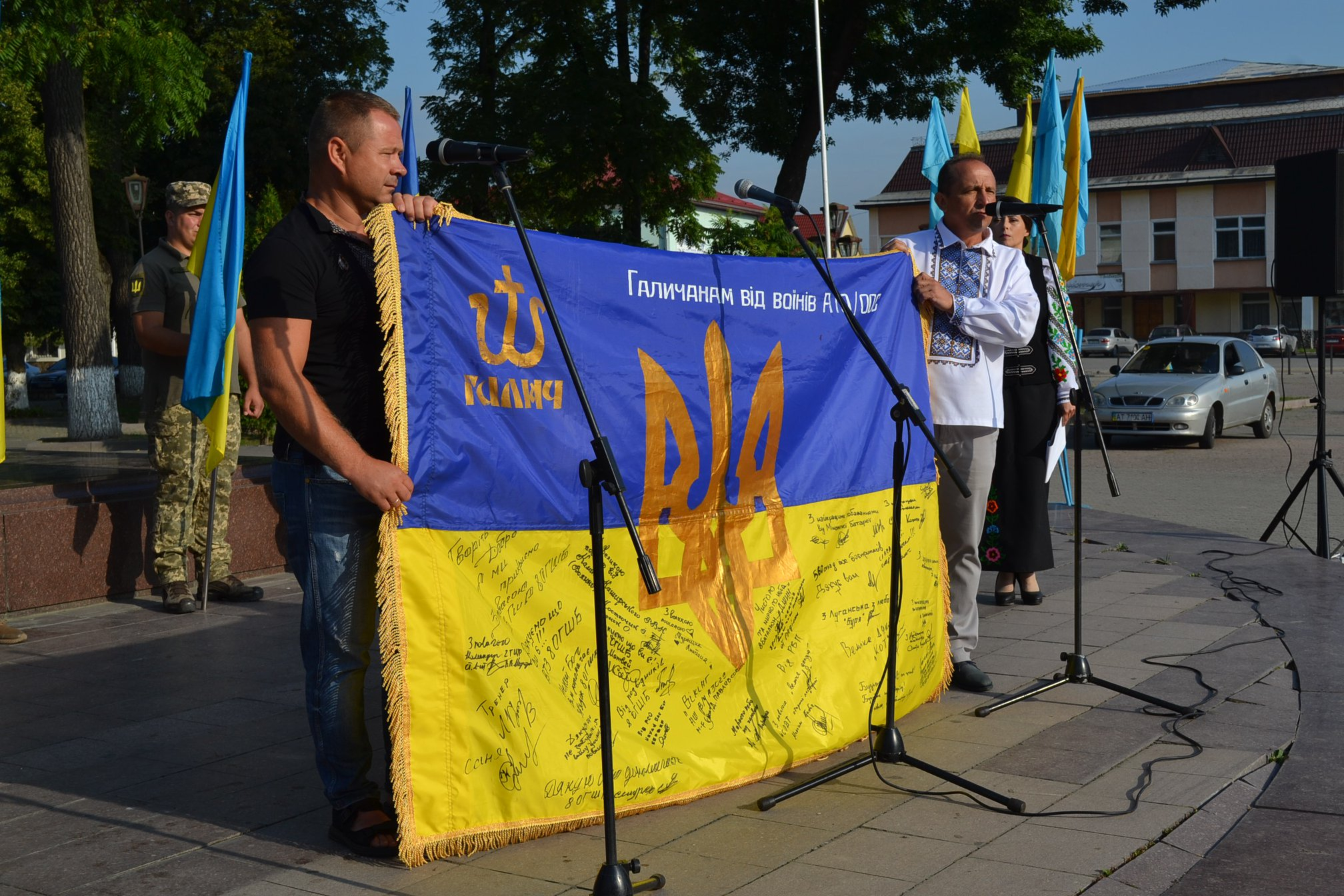 А на знак подяки землякам за підтримку волонтери Михайло Вітовський та Геннадій Гущук передали галичанам прапор, під яким воювали бійці 10-ї окремої гірсько-штурмової бригади.
