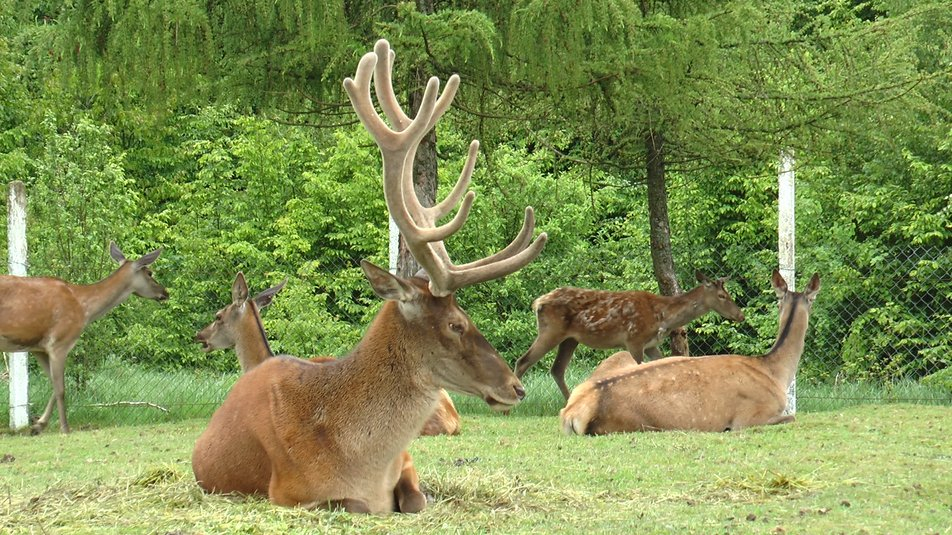Живе стадо муфлонів в одному вольєрі з оленями. Муфлони травоїдні. Тому сіно, трава і зернові - їхній основний раціон.
