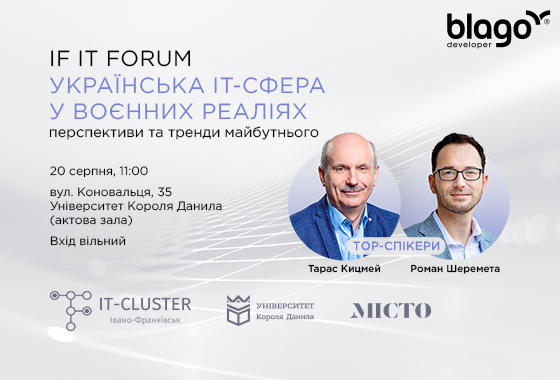 Тарас Кицмей, Роман Шеремета та інші провідні експерти розповідатимуть про виклики, з якими зіткнулася сфера інформаційних технологій в час війни. Форум відбуватиметься за ініціативи команди ІТ-кластер, компанії blago developer та Університету Короля Данила.