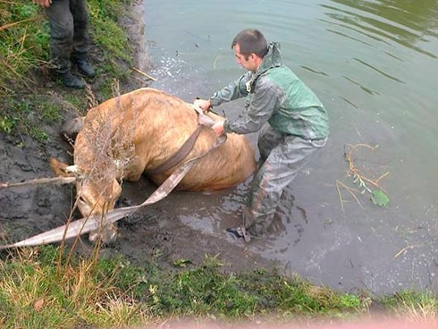 Вчора, 10 червня у Калуші рятувальники витягували корову, яка застрягла у намулі неподалік річки.
