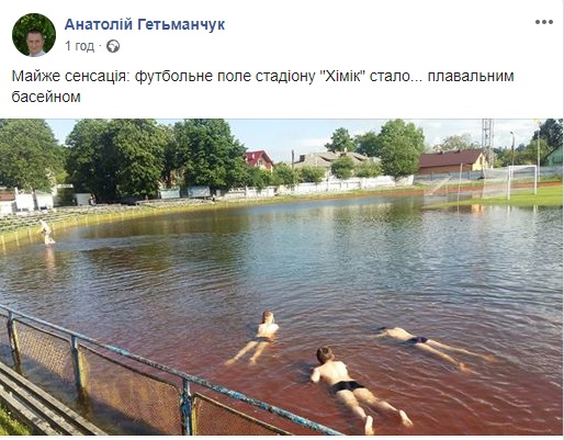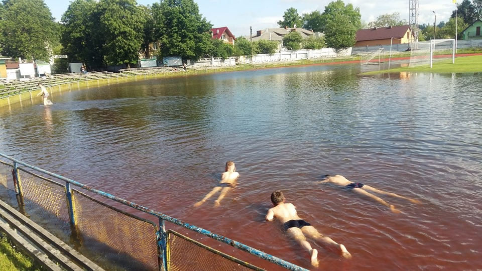 Сьогодні, 25 травня, мешканець Калуша Анатолій Гетьманчук виклав у мережу світлину, на якій підлітки купаються на затопленому стадіоні.