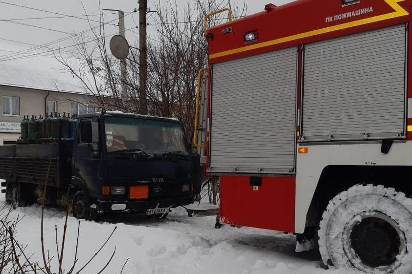 Через снігові замети автомобіль марки «Тата» не зміг самостійно здійснити транспортування балонів з киснем з території інфекційної лікарні.