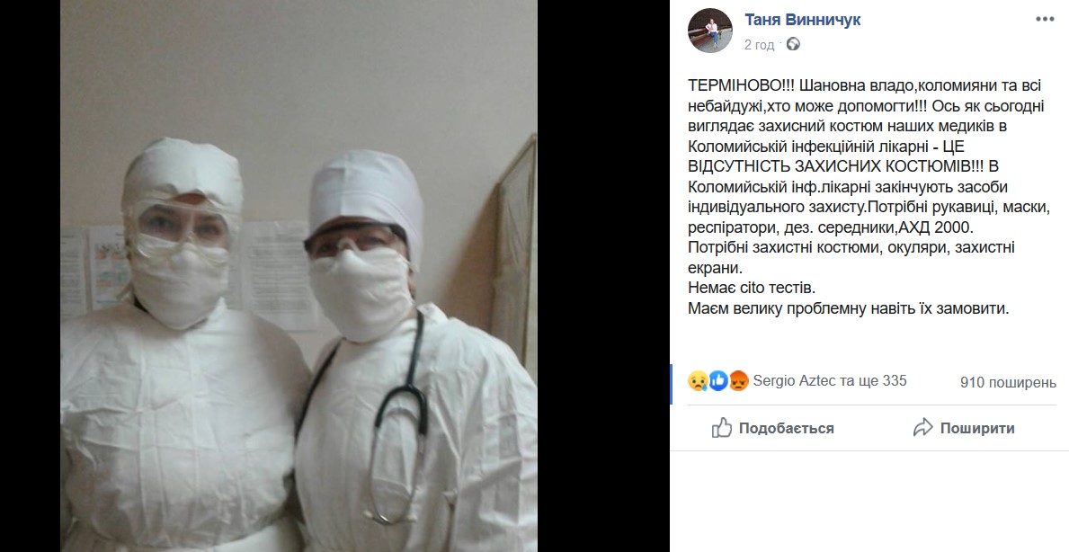 "ТЕРМІНОВО!!! Шановна владо, коломияни та всі небайдужі, хто може допомогти!!! Ось як сьогодні виглядає захисний костюм наших медиків в Коломийській інфекційній лікарні - ЦЕ ВІДСУТНІСТЬ ЗАХИСНИХ КОСТЮМІВ!!! В Коломийській інф.лікарні закінчують засоби індивідуального захисту. Потрібні рукавиці, маски, респіратори, дез. середники, АХД 2000. Потрібні захистні костюми, окуляри, захистні екрани. Немає cito тестів.