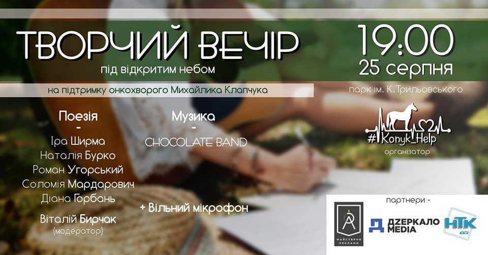 У неділю, 25 серпня, з ініціативи БФ Коник Хелп у парку ім. К. Трильовського відбудеться творчий вечір під відкритим небом.