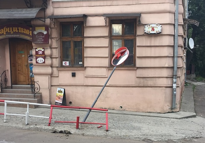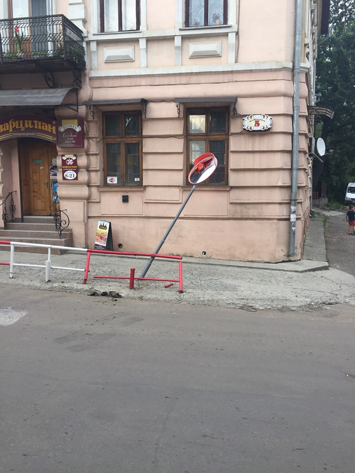 Водій екскаватора не впорався з керуванням та зніс частину огорожі разом з не дешевим дзеркалом.