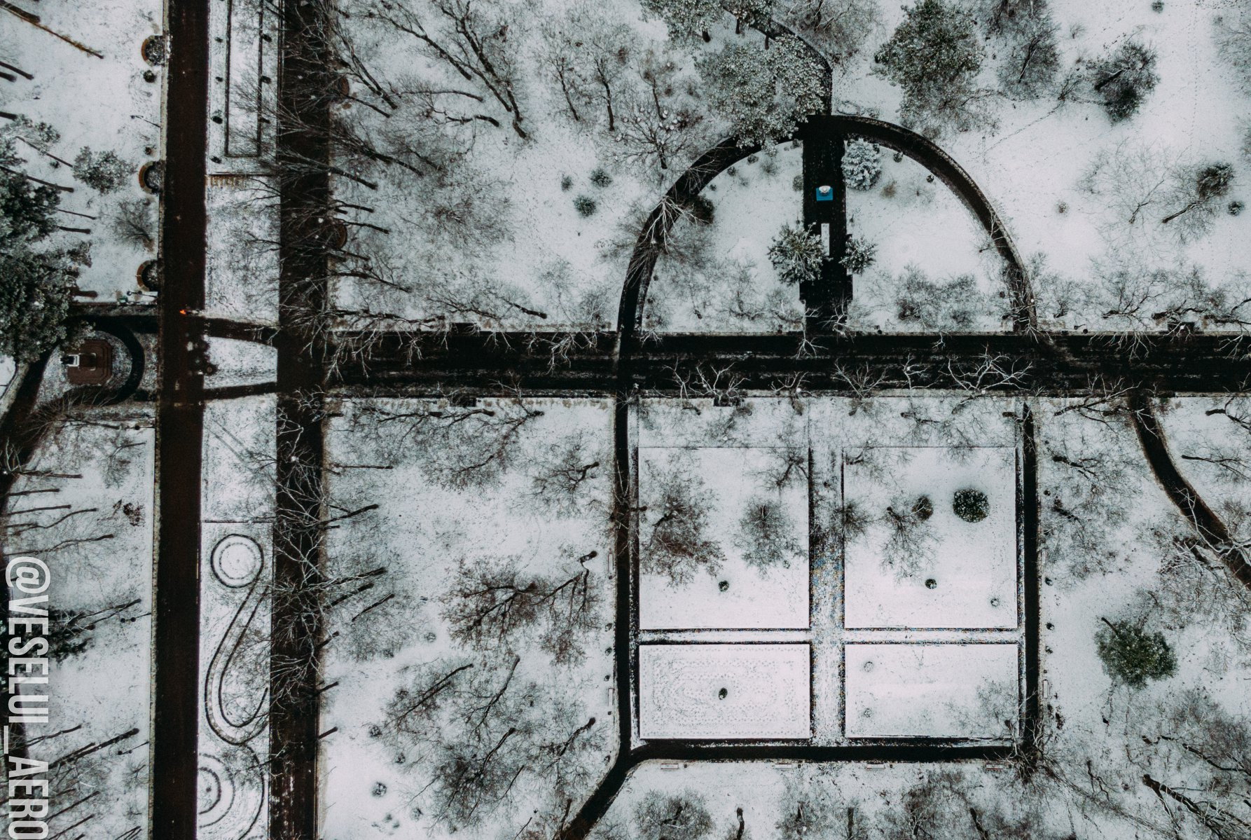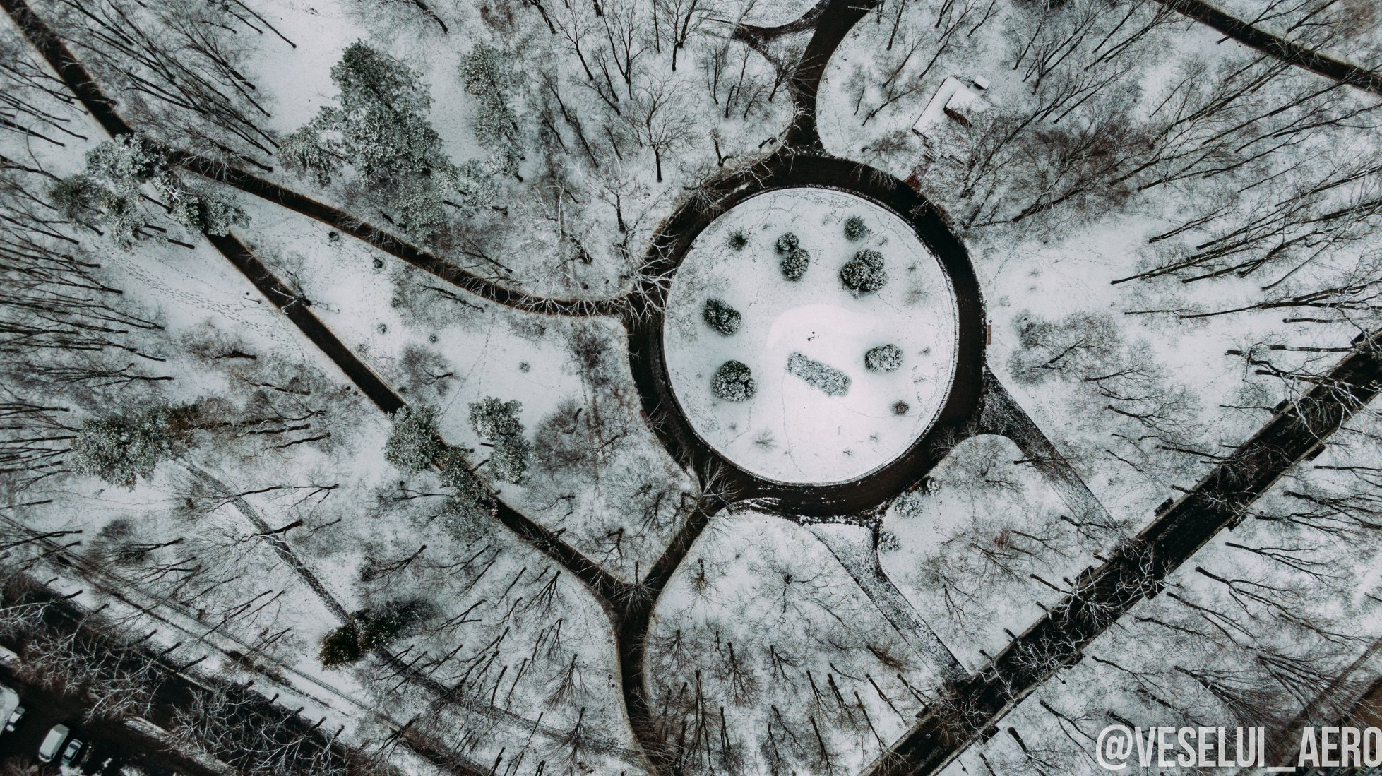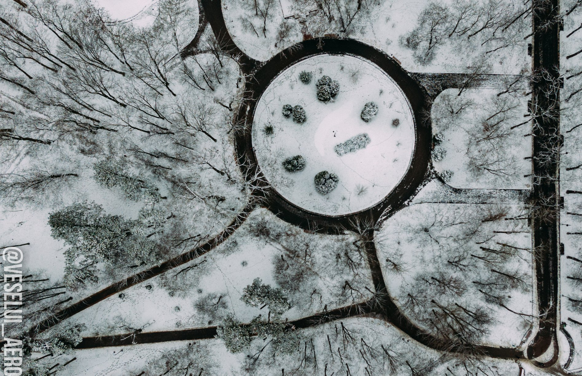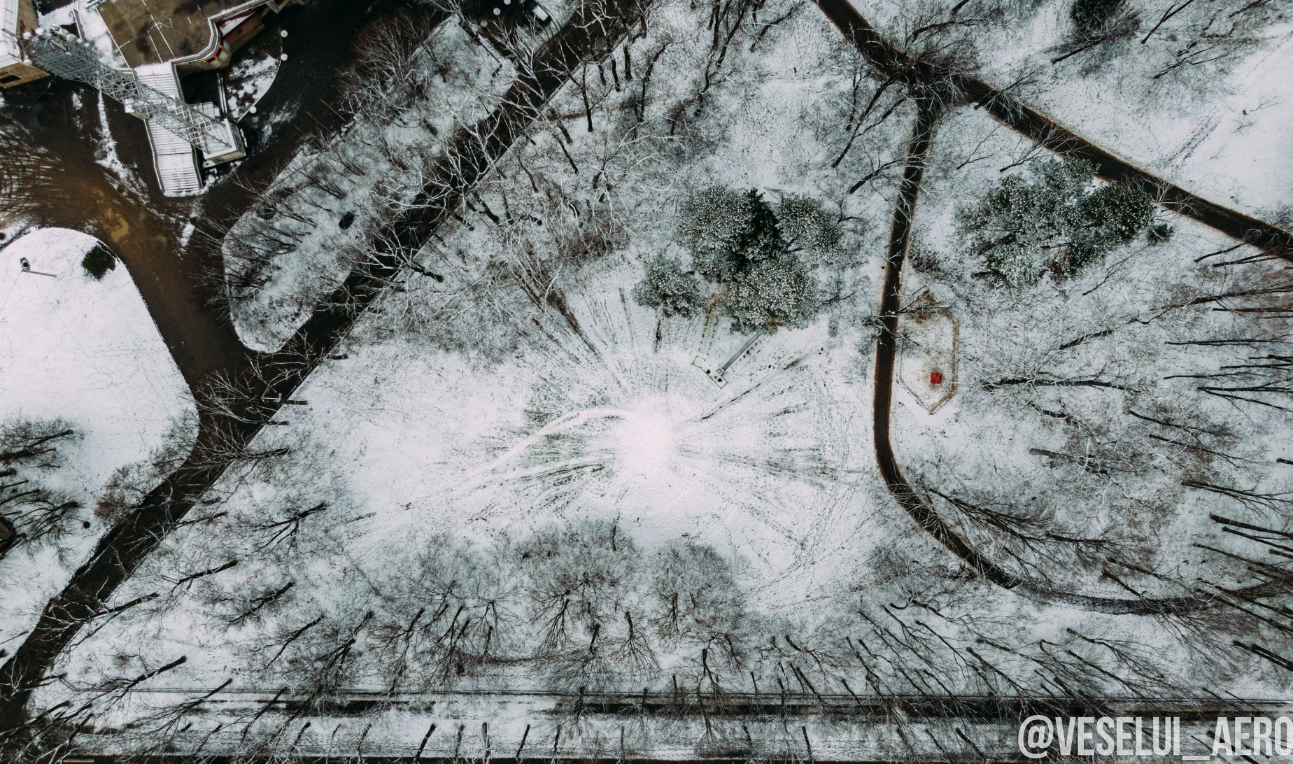 У мережі опублікували фото засніженого парку ім. Т. Шевченка з висоти пташиного польоту.