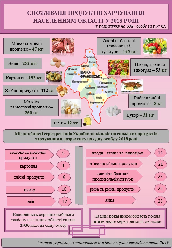 У 2018 році одним жителем області в середньому було спожито 145 кг овочів та баштанних продовольчих культур, 193 кг картоплі, 252 шт яєць (на 1–1,2% більше, ніж роком раніше), 47 кг м’яса та м’ясних продуктів (на 6,4% більше), 53 кг плодів, ягід та винограду (на 7,1% більше), 8 кг риби та рибних продуктів (на 8,2% більше).