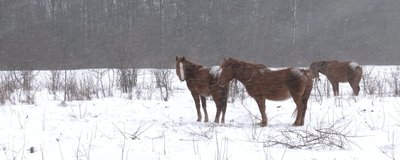 Село Тисменичани. Надворі - мінус 5, поривчастий вітер та снігопад. За сотні метрів від житлових будинків – місцеве пасовище. Посеред поля в таких умовах стоять троє коней. Двоє дорослих на прив'язі та лоша. Довкола - ані сіна, ані якихось кормів. Місцевий житель Віктор Федунишин розповідає, що тварини випасалися на цьому полі від осені. Проте, коли настала зима і погода значно погіршилася, господар коней не забрав до хліва.