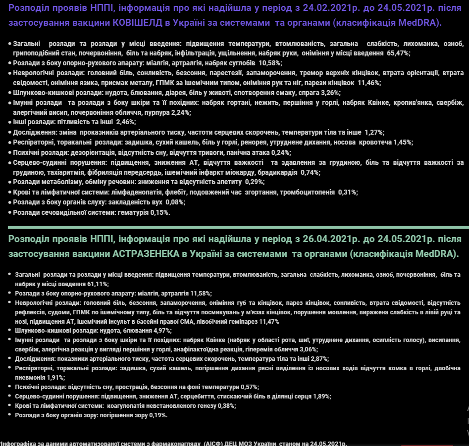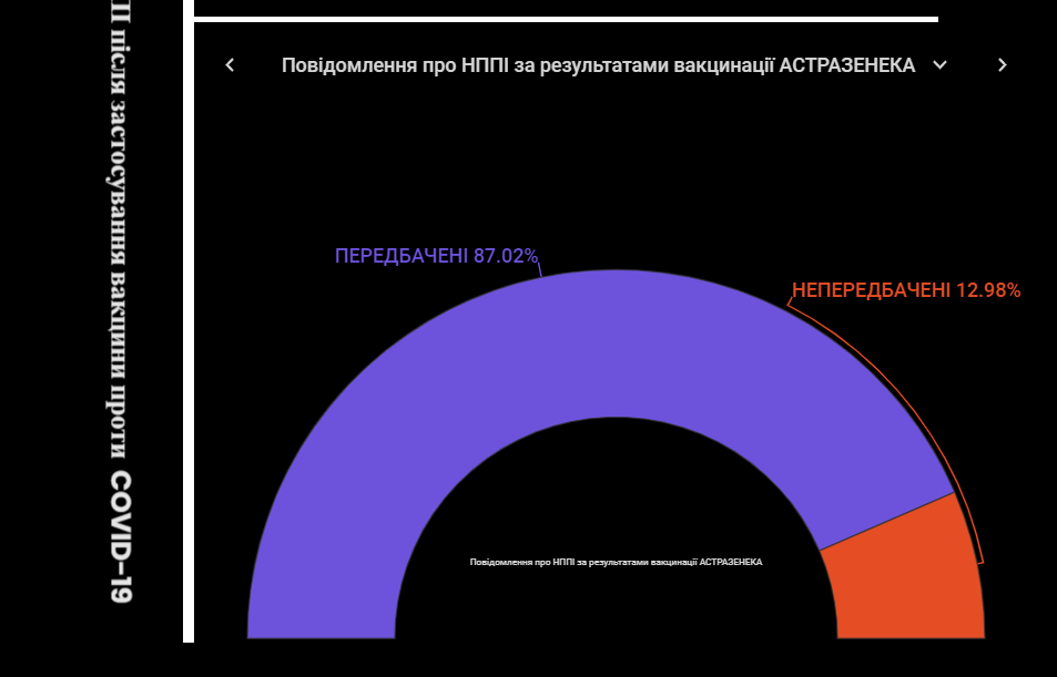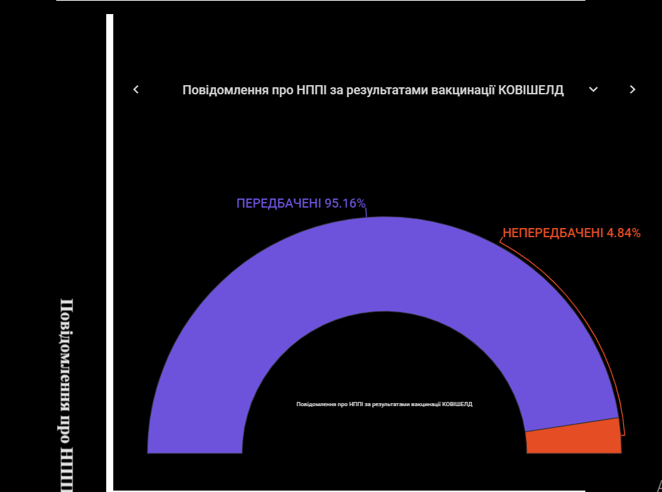 Після майже мільйона введених доз вакцин кількість карт-повідомлень про випадки несприятливих подій складає 1436. Відсоток виникнення НППІ – менш як 1%. А саме: