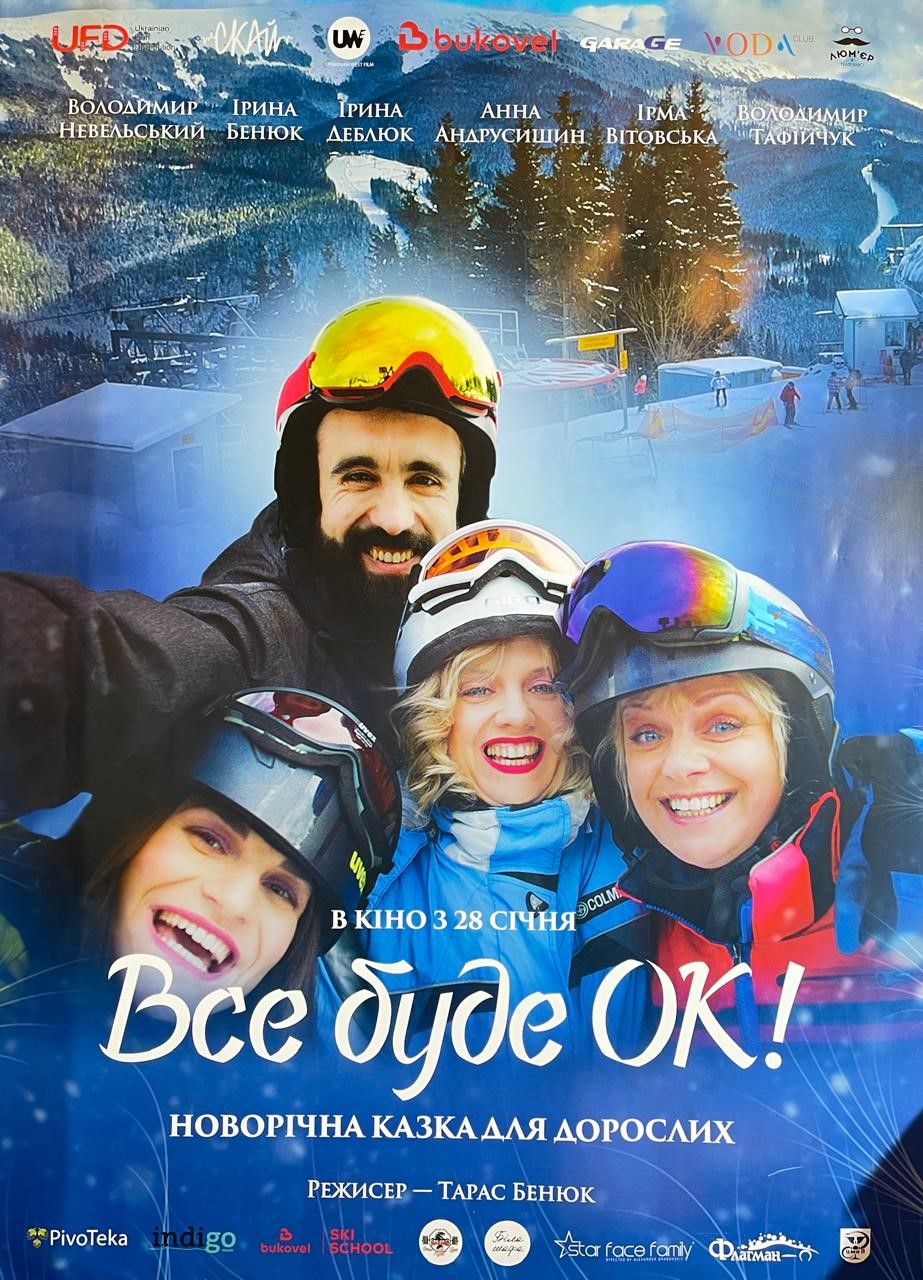 Афіша кіно «Все буде ок!», головним режисером якого є Тарас Бенюк. Зйомки кіно відбувалися в Івано-Франківську, Києві та в Буковелі