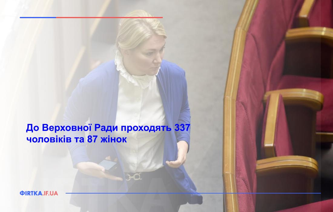 За даними Центральної виборчої комісії до Верховної Ради проходять 337 чоловіків (79,5%) та 87 (20,5%) жінок.  Таке представництво, на думку соціологів,  все ще залишається не репрезентативним, адже жінки складають 54% населення країни, однак є кроком вперед у порівнянні з усіма попередніми скликаннями Верховної Ради, пише Фіртка.
