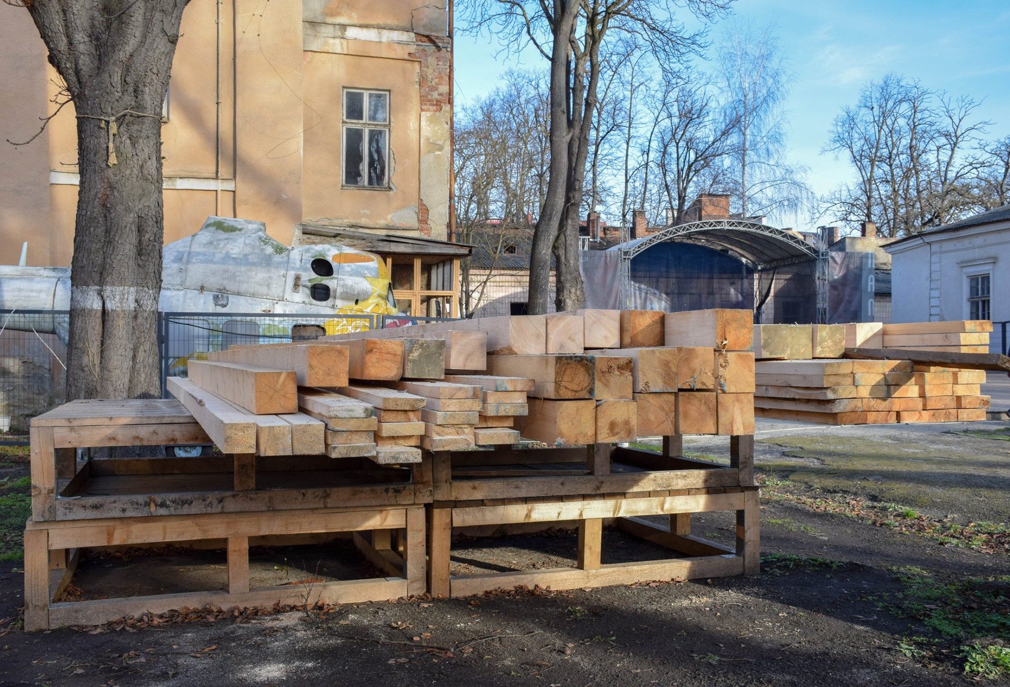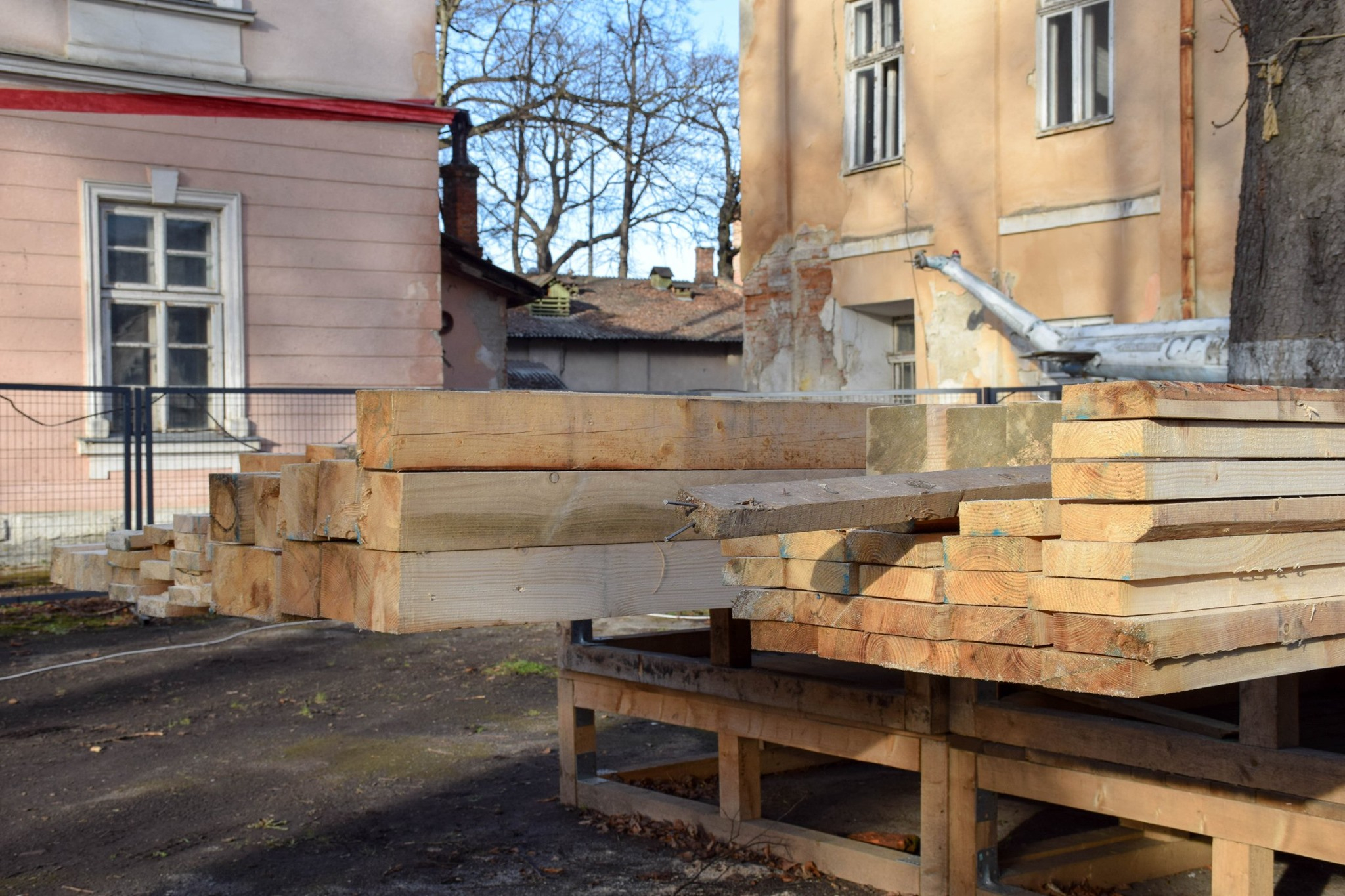 "У комплексному проєкті ця частина робіт передбачена, але її «витягнули» окремо, щоб швидко зробити зовнішнє укріплення. Це мають бути дерев’яні зовнішні підпори під гостроаварійни кут. Вже укладено договір із підрядником. Більше того, вже закладені фундаменти під опори і заготовлено матеріал (дерев’яні бруси, дошки). Тепер чекаємо, поки бетон набере міцності. Для цього він має, як мінімум, два тижні вистоятися і «схопити» закладні. Погода у цьому сприяє. Тож вже найближчим часом будемо продовжувати роботи із дерев'яними елементами підпор, щоб зафіксувати той кут", – розповідає директор КП «Простір інноваційних креацій «Палац» Володимир Гайдар.