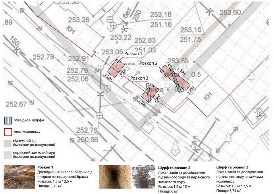 Розкопки на першому етапі будуть вестися в кілька черг, перша з яких буде стосуватися господарської брами, території з обох боків біля брами та огорожі. Другою чергою буде закладено один з шурфів для дослідження підземного ходу і фундаментів муру біля корпусу З. Наступним етапом, згідно з програмою, планується досліджувати центральне і праве крило палацу, суміжно з корпусом Ж, під якими ймовірно, є підземна частина палацу із його фундаментом.
