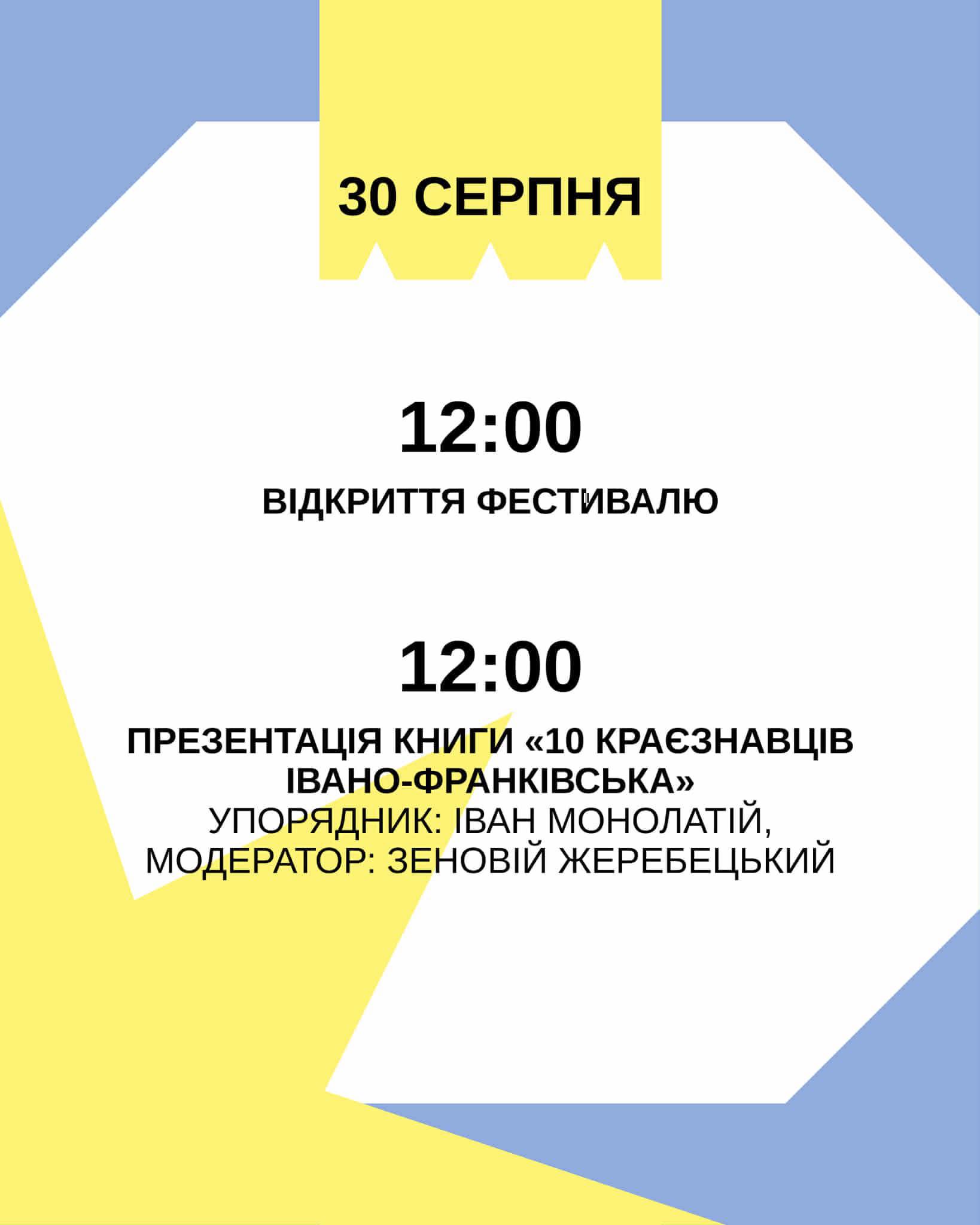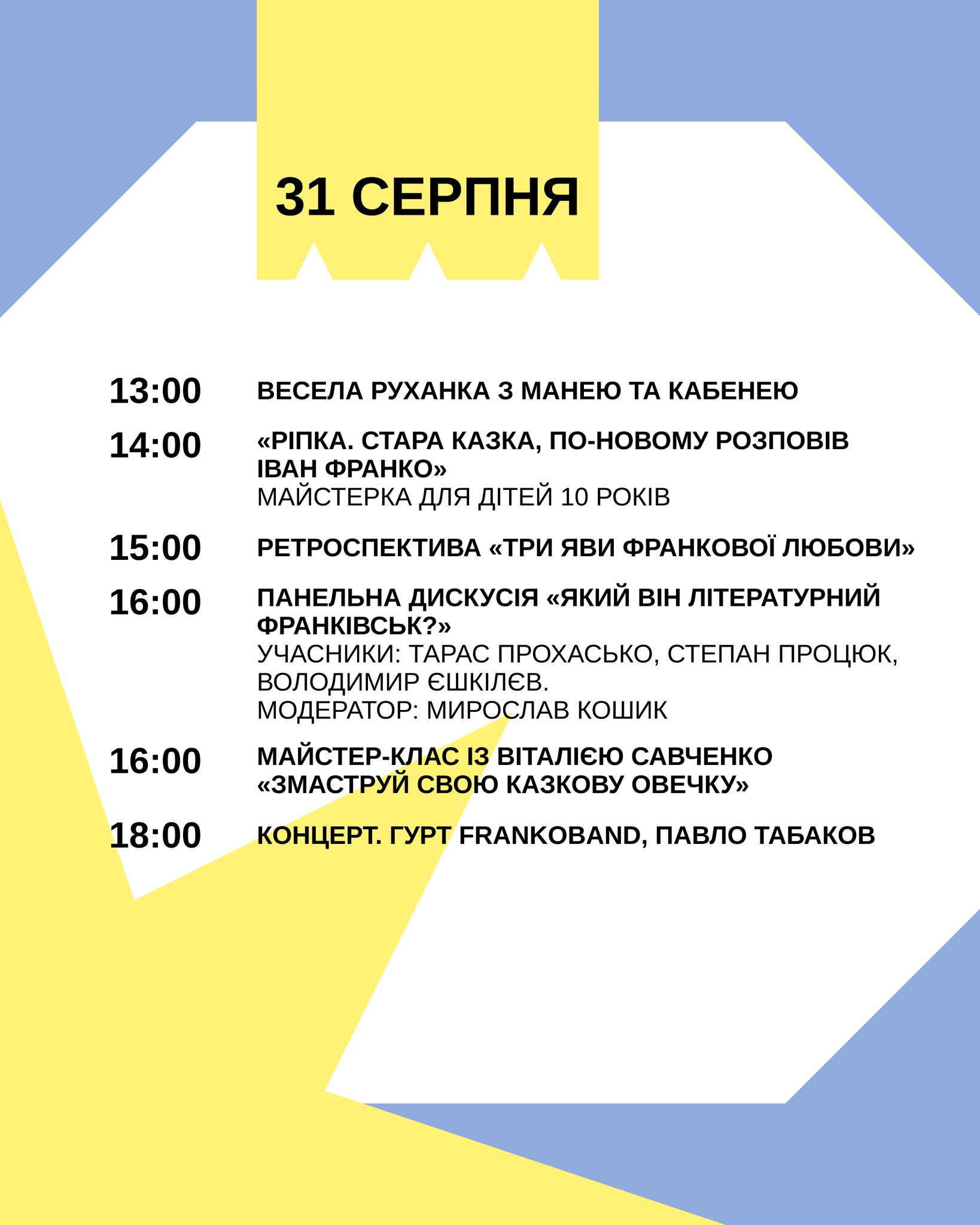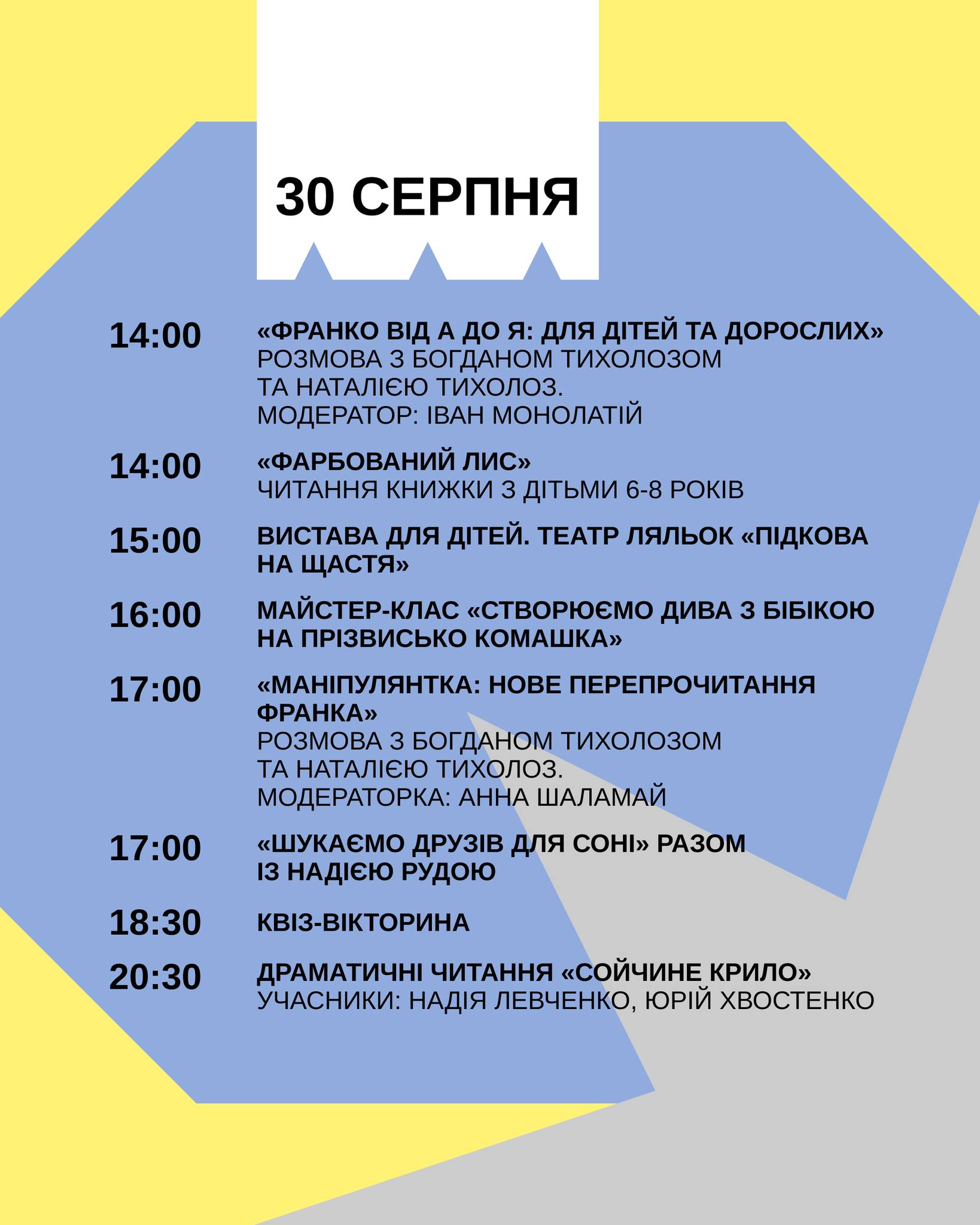 За його словами, 30 серпня події розпочнуться о 14:00 та триватимуть до вечора, а 31 серпня — з 13:00 до 20:00. У програмі — панельні дискусії, театральні вистави, благодійний концерт, майстер-класи для дітей, вікторини та читання книжок, зокрема твору «Фарбований Лис».