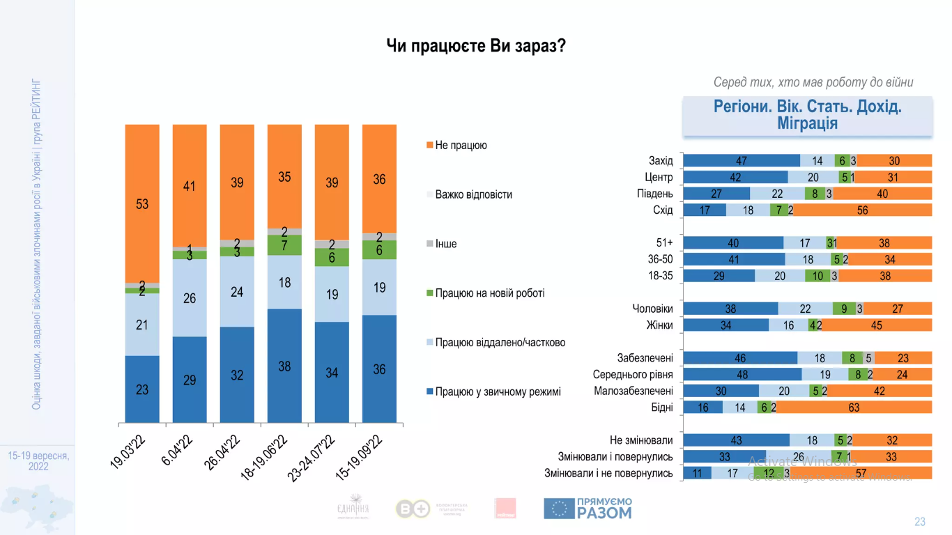Наразі серед тих, хто мав роботу до війни, працюють 61%: повноцінно – 36%, віддалено або частково – 19%, знайшли нову роботу — 6%.