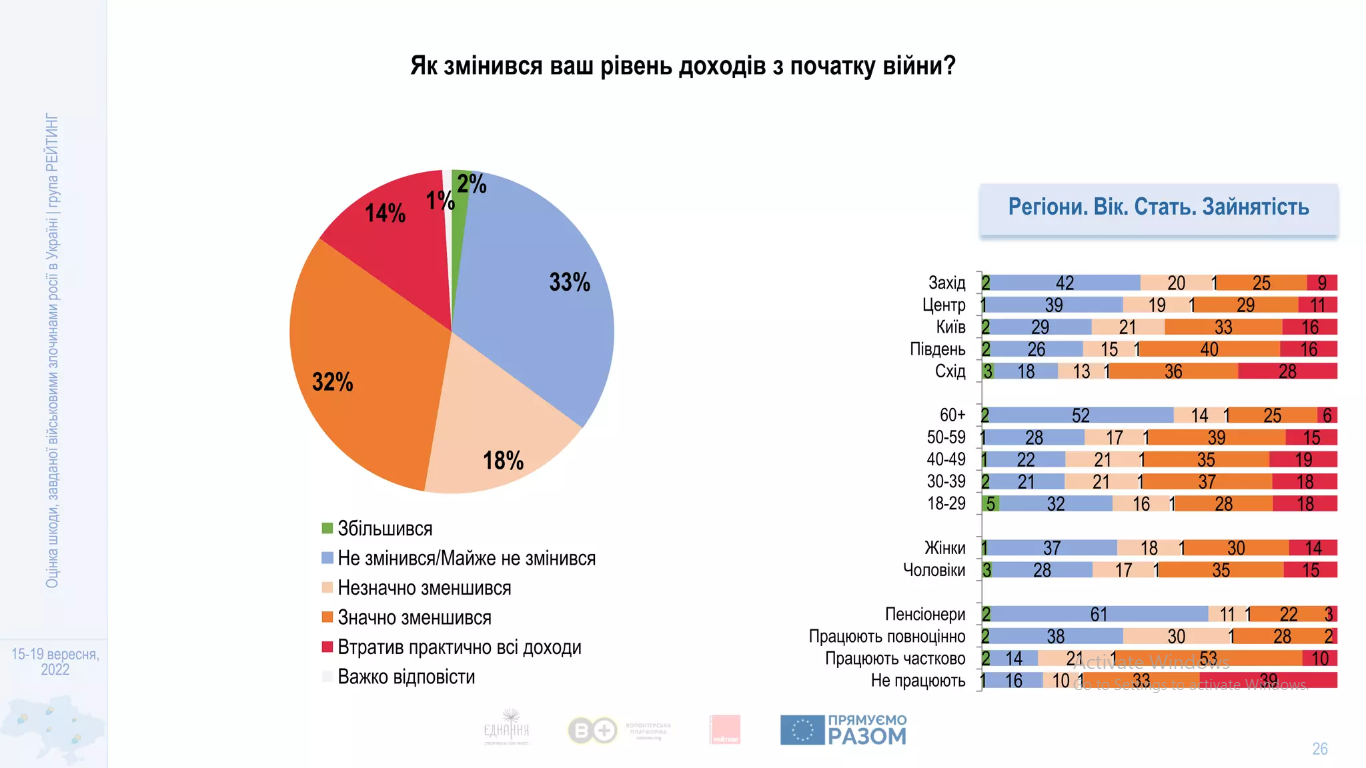 З початку великої війни лише у 2% респондентів рівень доходів збільшився, у 33% — не змінився. Натомість у двох третин опитаних спостерігається погіршення ситуації із доходами: у 18% — незначно зменшився дохід, у 32% — значно зменшився, 14% втратили практично всі доходи.