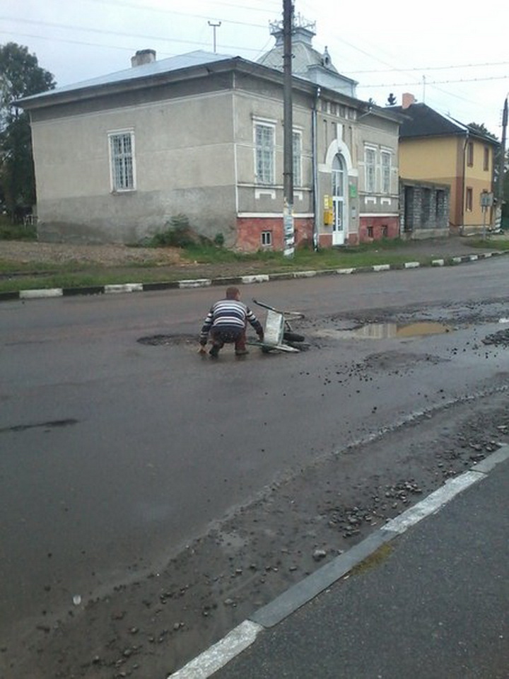 У селищі Отинія, що на Коломийщині, місцевий мешканець вирішив самотужки ремонтувати дорогу.