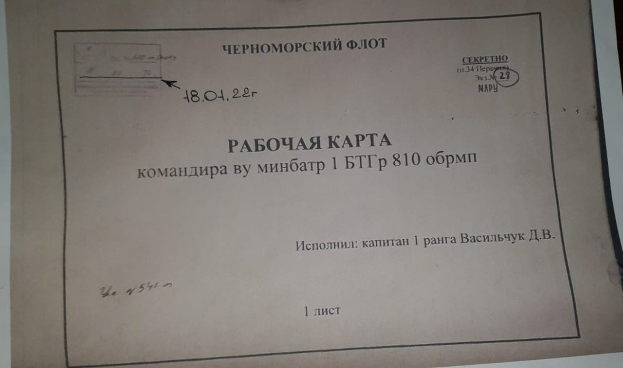 "В паніці вони лишають і таємні документи. Так, у нашому розпорядженні опинилися планувальні документи одного з підрозділів батальйонної тактичної групи 810-ї окремої бригади морської піхоти Чорноморського Флоту Російської Федерації", - йдеться у дописі.