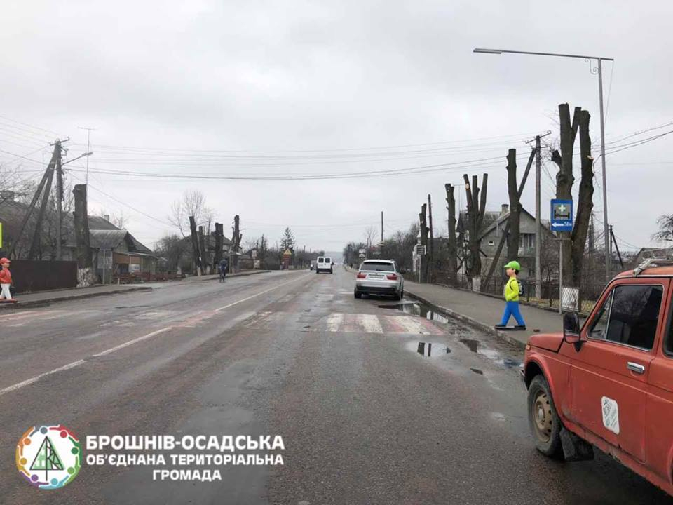 "Яскравий колір та схожість зі справжньою дитиною мають змусити водіїв пригальмувати перед пішохідним переходом. "Встановили манекени для безпеки руху школярів та мешканців селища. Це встановили з попереджувальною метою", – розповідає про задум голова Брошнів-Осадської ОТГ Назарій Іванів.
